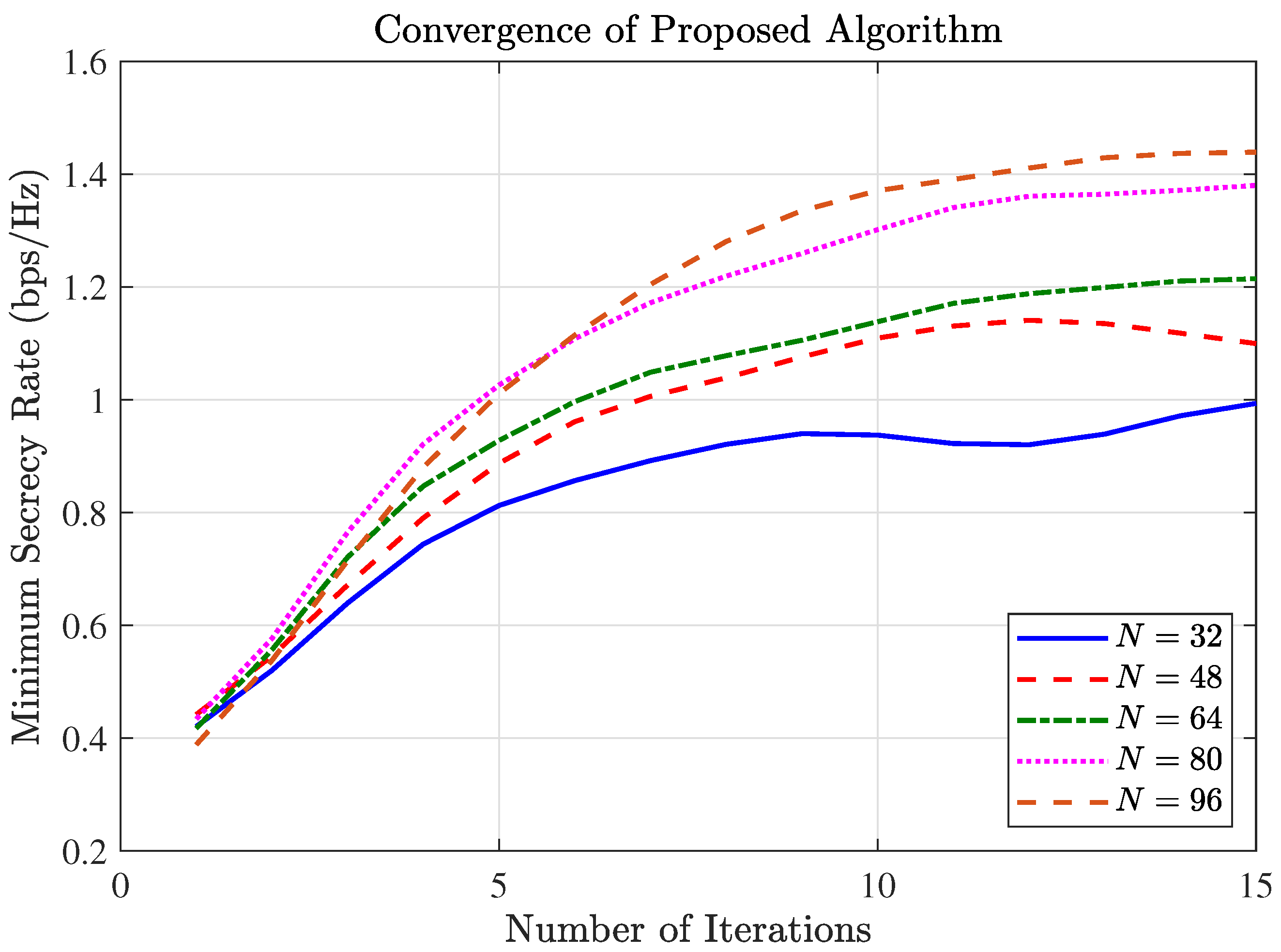 Figure 2, the secrecy rate increases monotonically and typically reaches a stable plateau after approximately 10 iterations. This behavior confirms that the algorithm satisfies the convergence criterion (fractional increase below