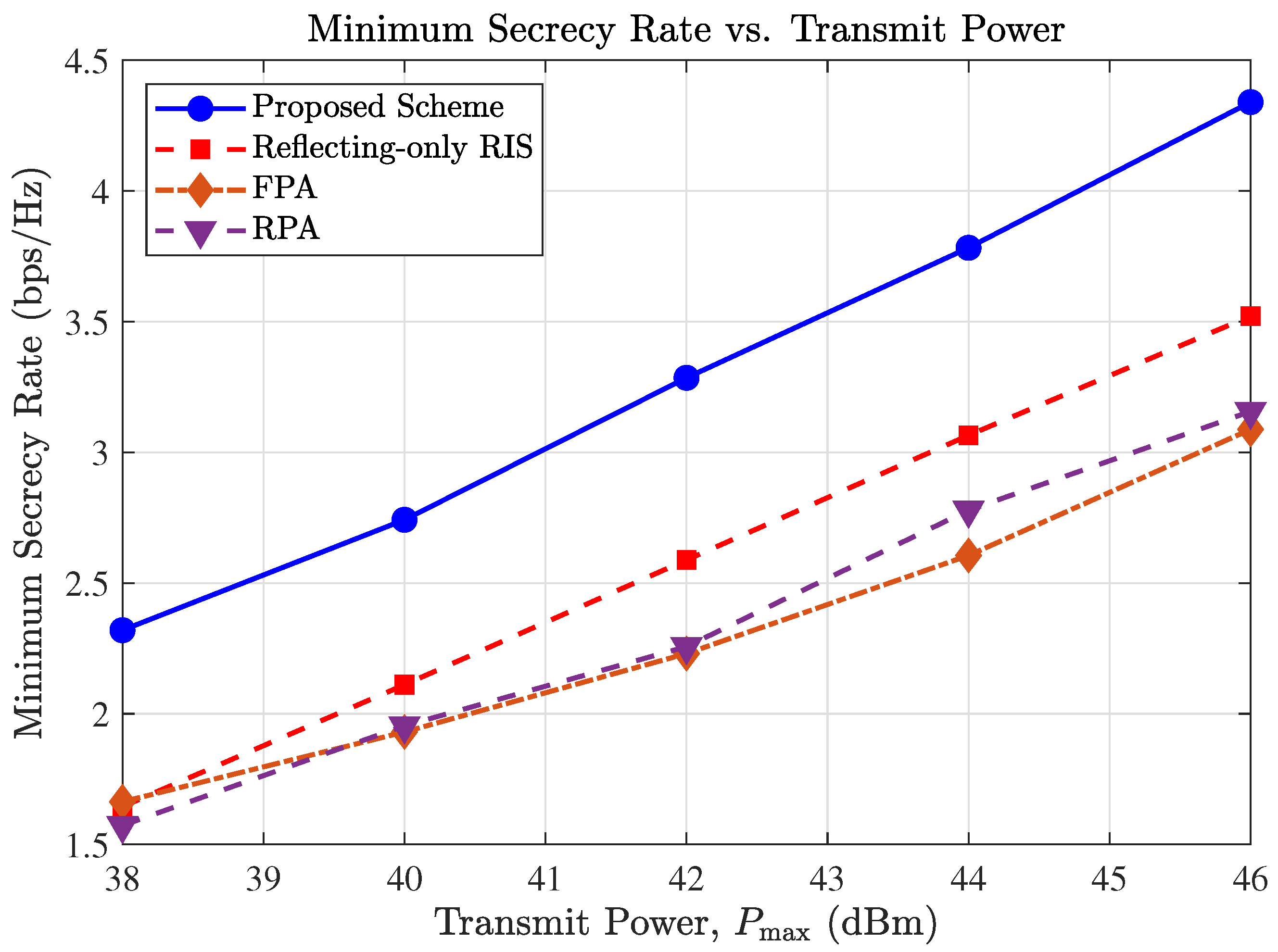Figure 3 illustrates the minimum secrecy rate versus the maximum transmit power at the BS,