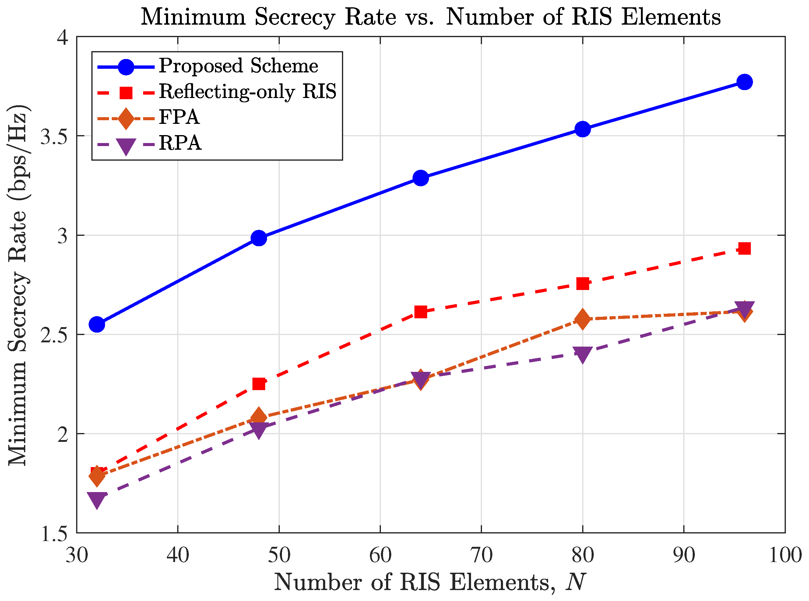 The channel model for the BS-RIS link is assumed to follow Rician fading with a Rician factor of dB, reflecting a dominant line-of-sight (LoS) path. All other links are modeled using Rayleigh fading. The large-scale path loss is modeled as , where dB is the path loss at a reference distance of 1 m. The path loss exponents for the BS-RIS and RIS-Users/Eve links are set to and , respectively. The maximum transmit power at the BS is dBm, and the noise power is dBm. The carrier frequency is GHz. Our iterative algorithm terminates when the fractional increase of the objective function is below a tolerance of or after a maximum of 15 iterations. The final results are averaged over 200 Monte Carlo trials.
