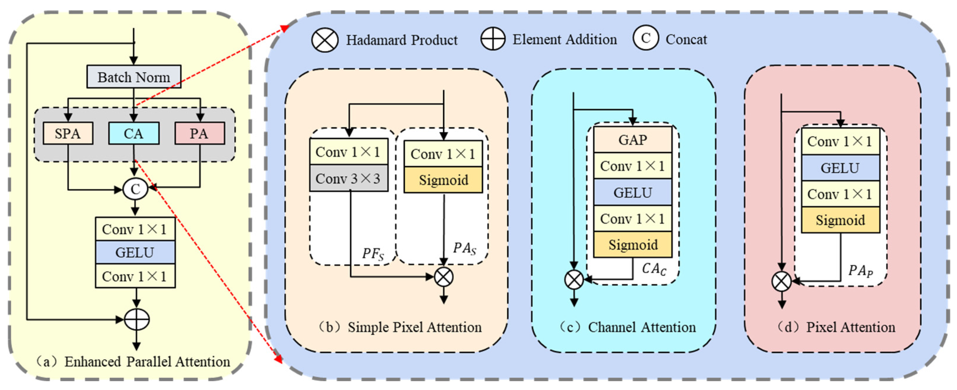 - We propose an Enhanced Parallel Attention (EPA) module that integrates multiple attention mechanisms in parallel to refine and filter feature streams, while extracting both globally shared information and position-dependent local cues, thereby enabling targeted enhancement and reconstruction of edge textures and high-frequency details in remote sensing images.