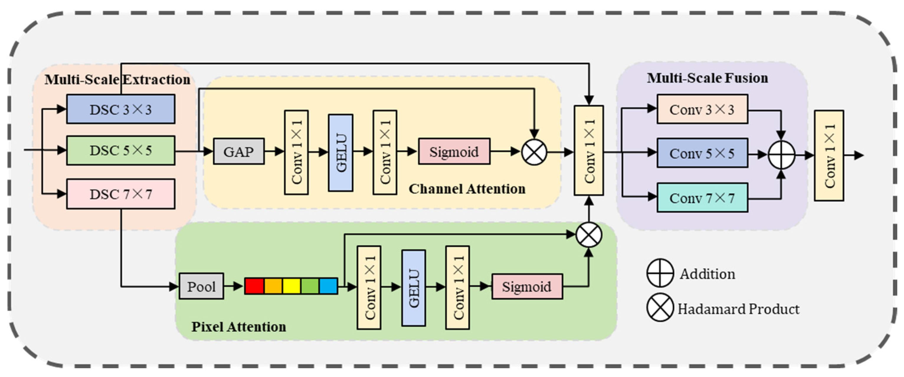 - We design a dual-branch feature extraction architecture: the main branch employs hybrid structural blocks to focus on local feature extraction, enhancing the recovery of high-information-entropy regions; the auxiliary branch combines multi-scale depthwise separable convolutions with dual attention mechanisms, effectively reducing computational complexity and strengthening global context modeling.