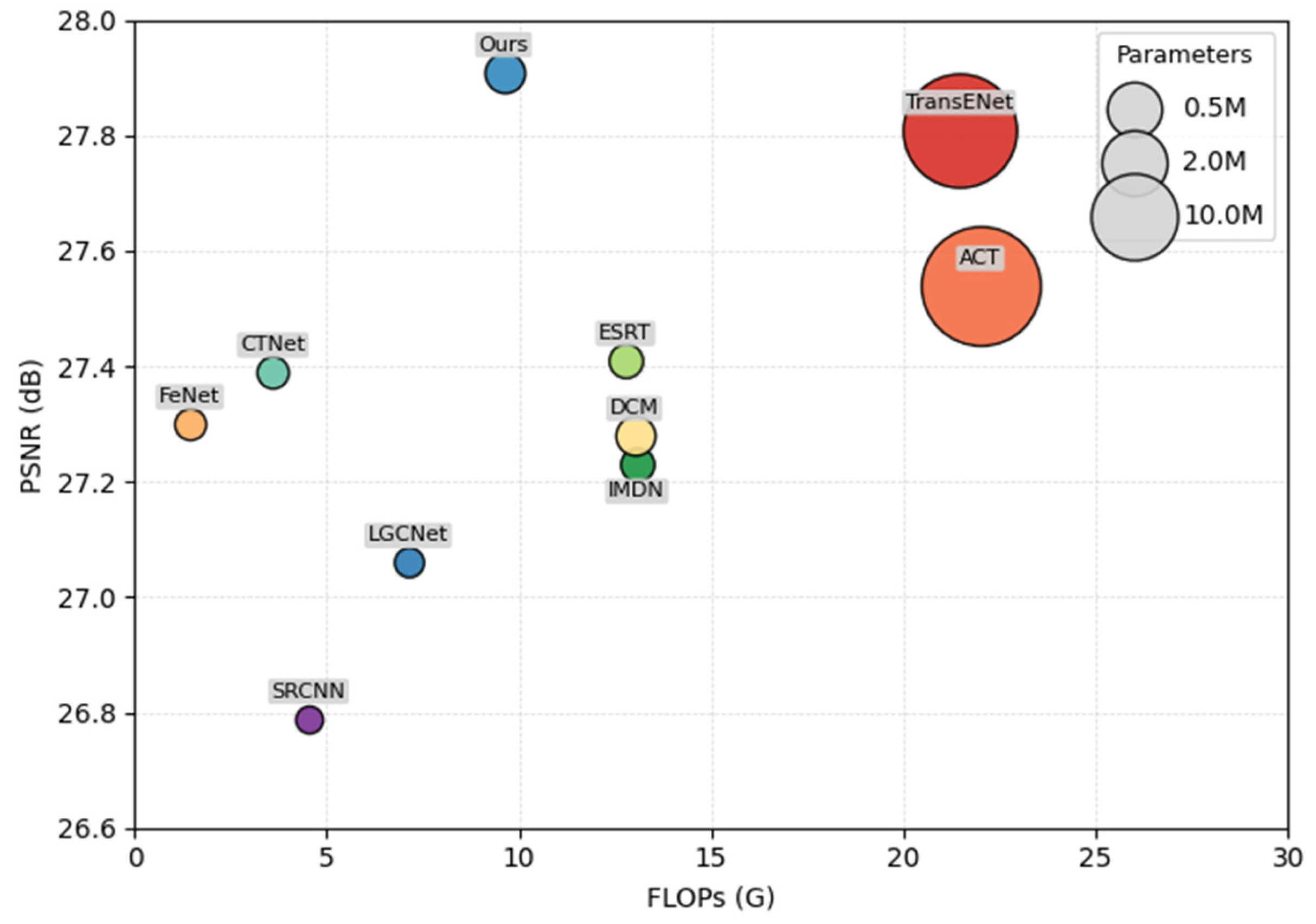 | Class | SRCNN | LGCNet | IMDN | CTNet | ESRT | FeNet | DCM | ACT | TransEnet | SSTNet | Ours |