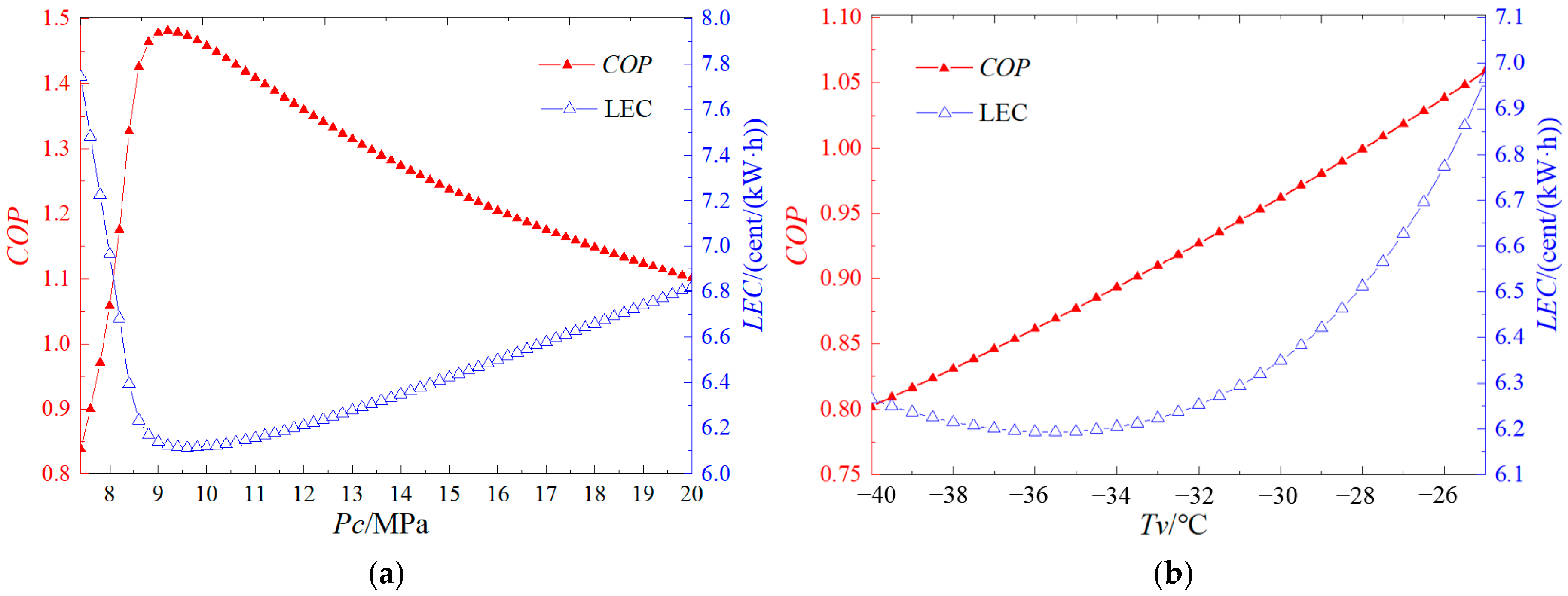 Figure 2b, COP consistently increases with rising evaporation temperature, whereas LEC initially decreases and subsequently increases, attaining its minimum value at an evaporation temperature of −35.5 °C. Thus, while an increase in evaporation temperature benefits COP, it adversely affects LEC. This phenomenon can be attributed to the fact that, with a fixed cooling temperature, an increase in evaporation temperature reduces the temperature difference across the evaporator, leading to a required increase in the heat transfer area, which ultimately results in higher costs.