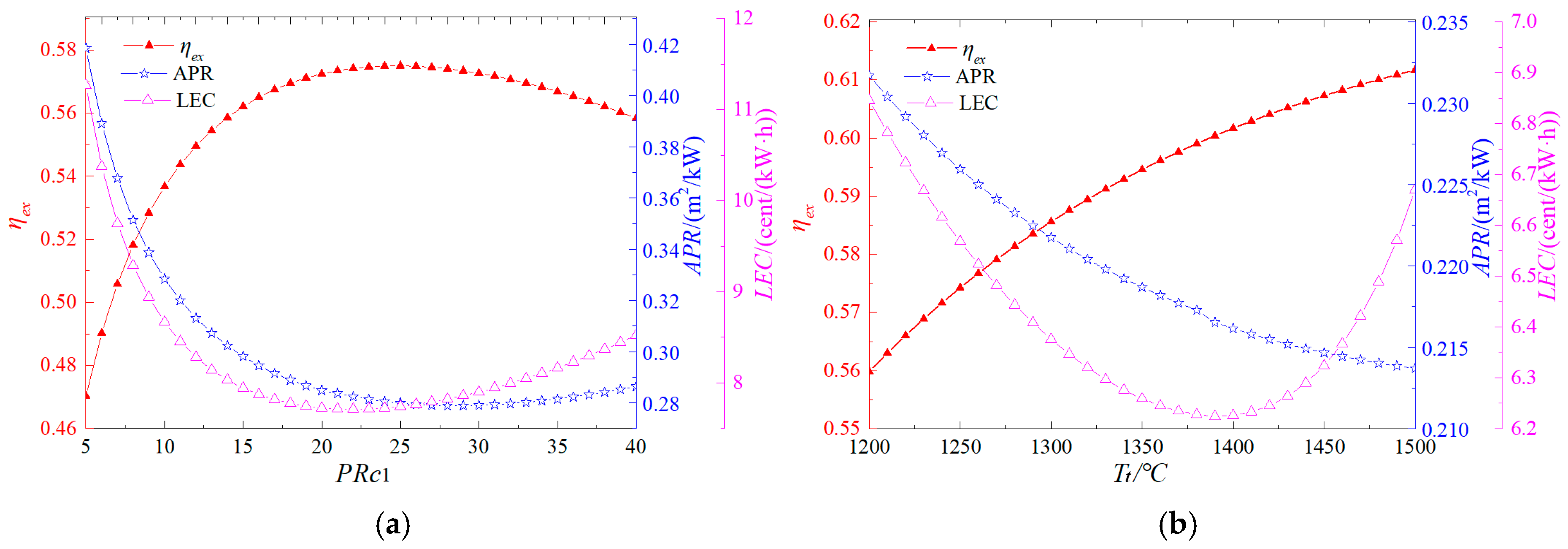 (4) When optimizing for exergy efficiency, APR, and LEC, the system achieved an optimal exergy efficiency of 59.5%, an APR of 0.21 m2/kW, and an LEC of 6.3 cents/(kW·h). The corresponding optimal parameters were PRc1 = 31, Tₜ = 1405 °C, PRc2 = 3.3, ΔT1 = 76 °C, and ΔT2 = 65 °C.