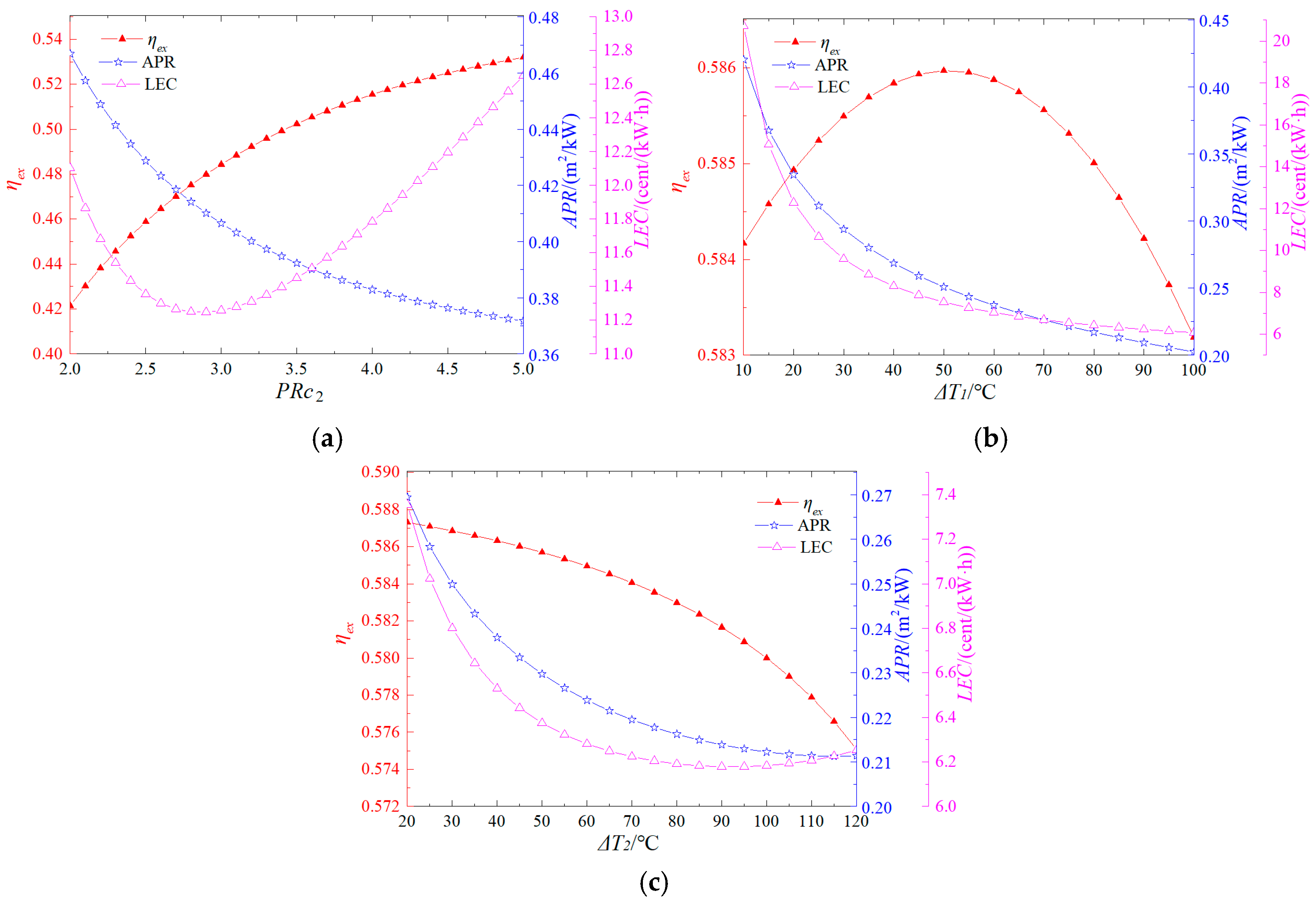 ηₓ), levelized energy cost (LEC), and area per unit power output (APR)-two objective functions can be selected based on specific application requirements. In this case, exergy efficiency and LEC were chosen for dual-objective optimization to improve system performance.