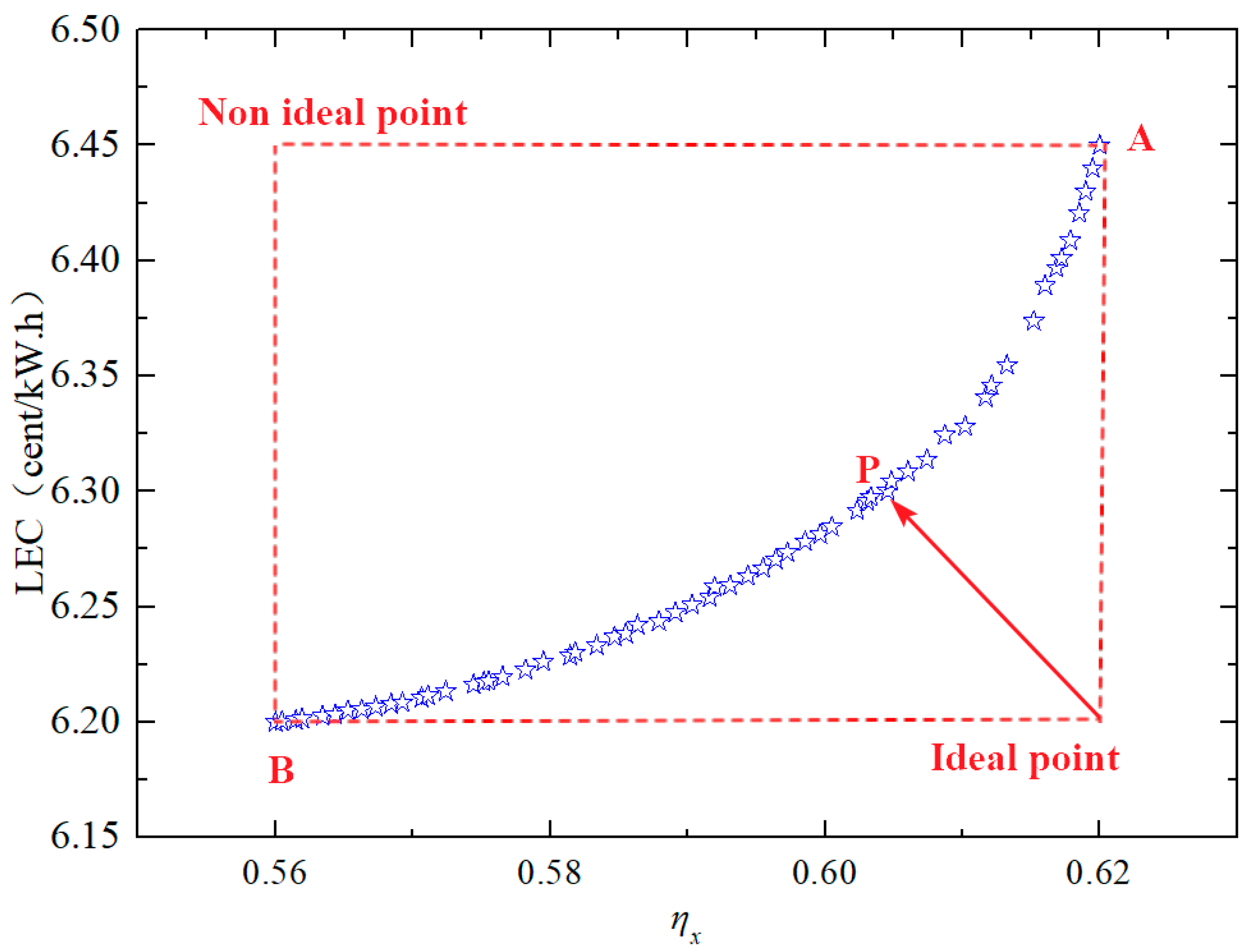 Figure 7, point A achieves an exergy efficiency of 62% and an LEC of 6.45 cents/(kW·h), indicating the best thermodynamic performance but the worst economic performance. Conversely, point B yields the lowest exergy efficiency (56%) and LEC (6.2 cents/(kW·h)), signifying the best economic performance but the poorest thermodynamic performance. Notably, no single point on the Pareto frontier can simultaneously maximize exergy efficiency and minimize the unit power cost.