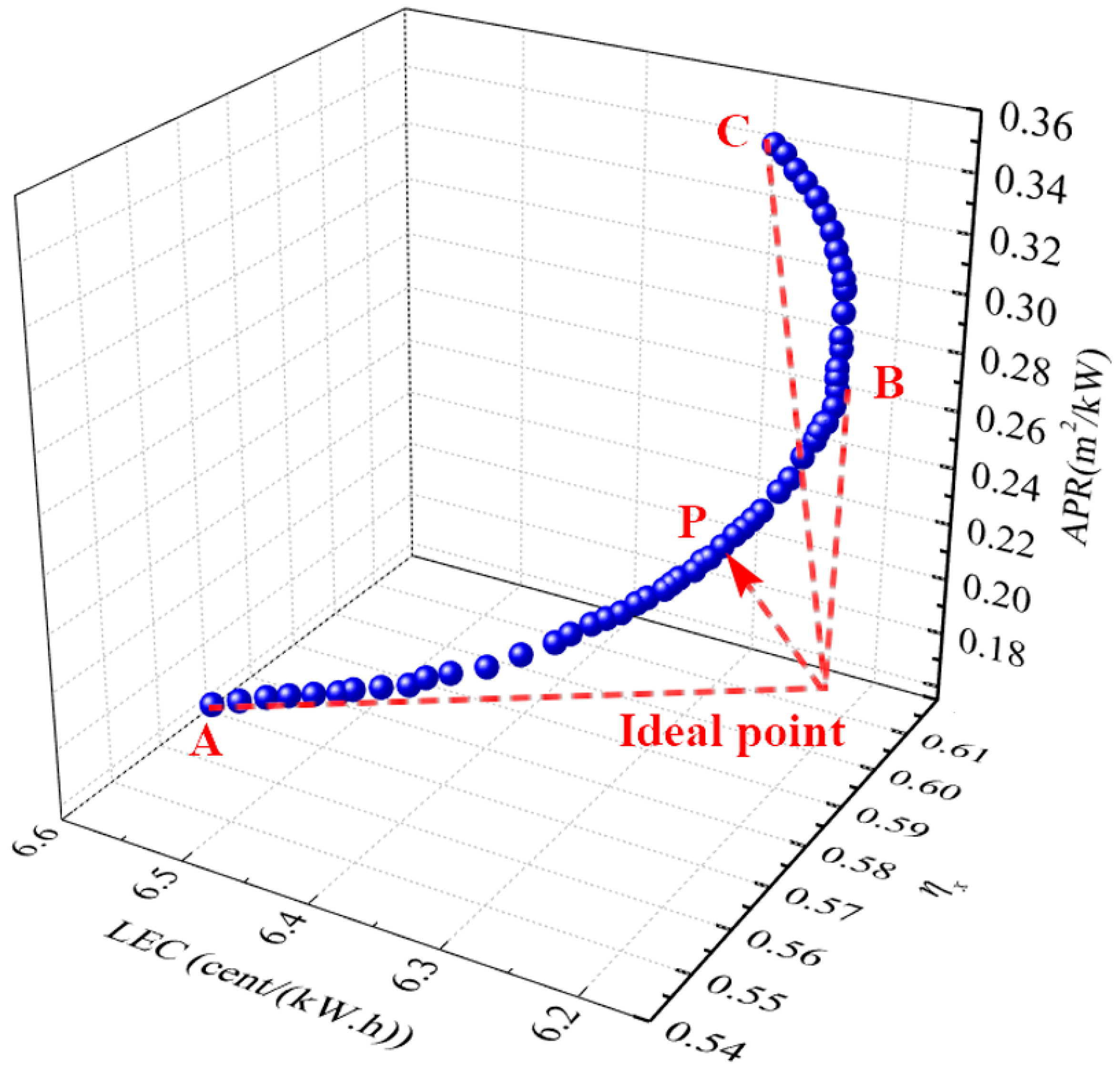 Figure 8, point C achieves the highest exergy efficiency of 61% and the lowest LEC of 6.194 cents/(kW·h), while point A exhibits the lowest APR of 0.2 m