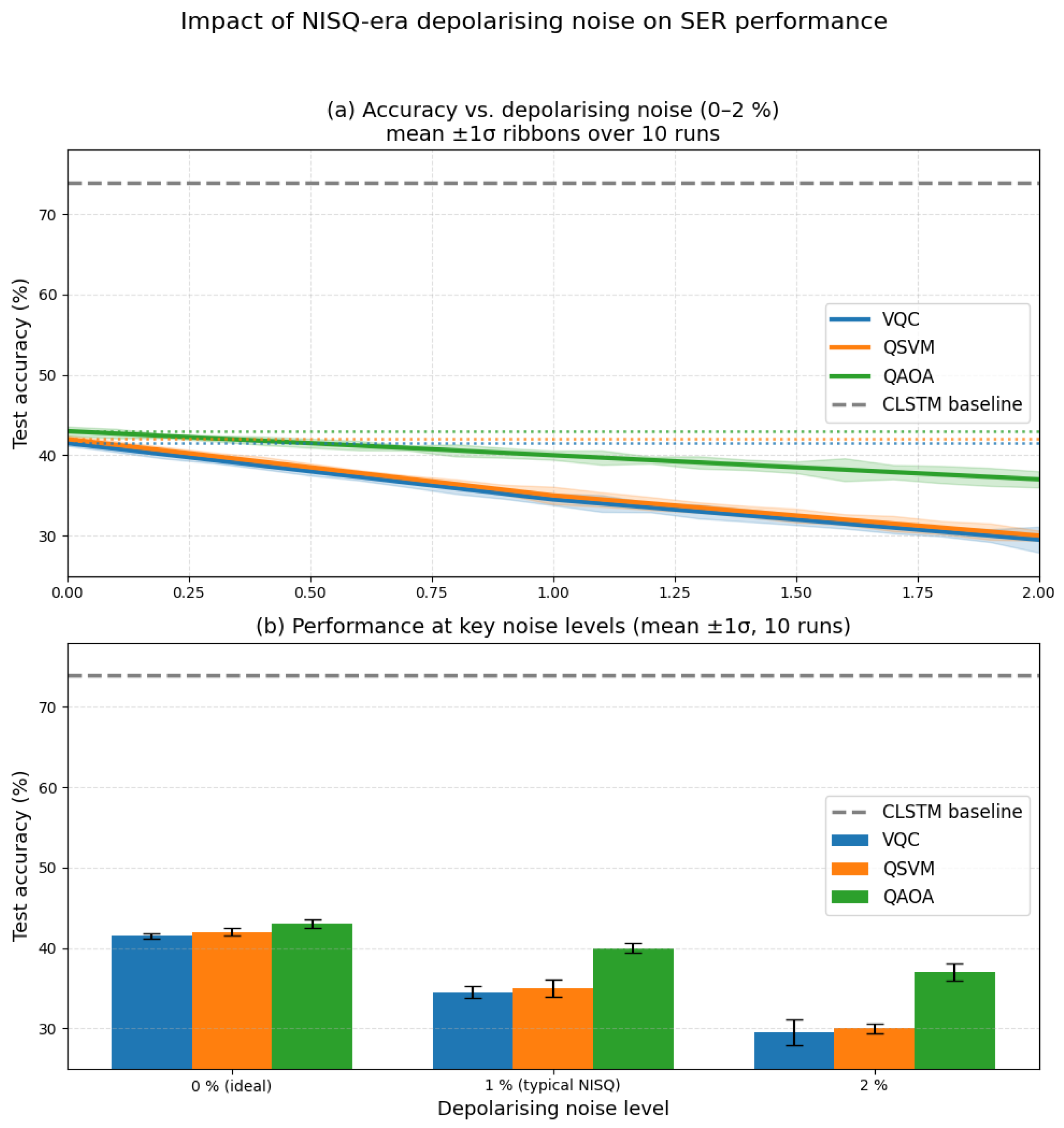 - Current We formatted this as a list. Please confirm. best NISQ results on this task lie in the 34–40% range under realistic 1% depolarising noise (Figure 5).