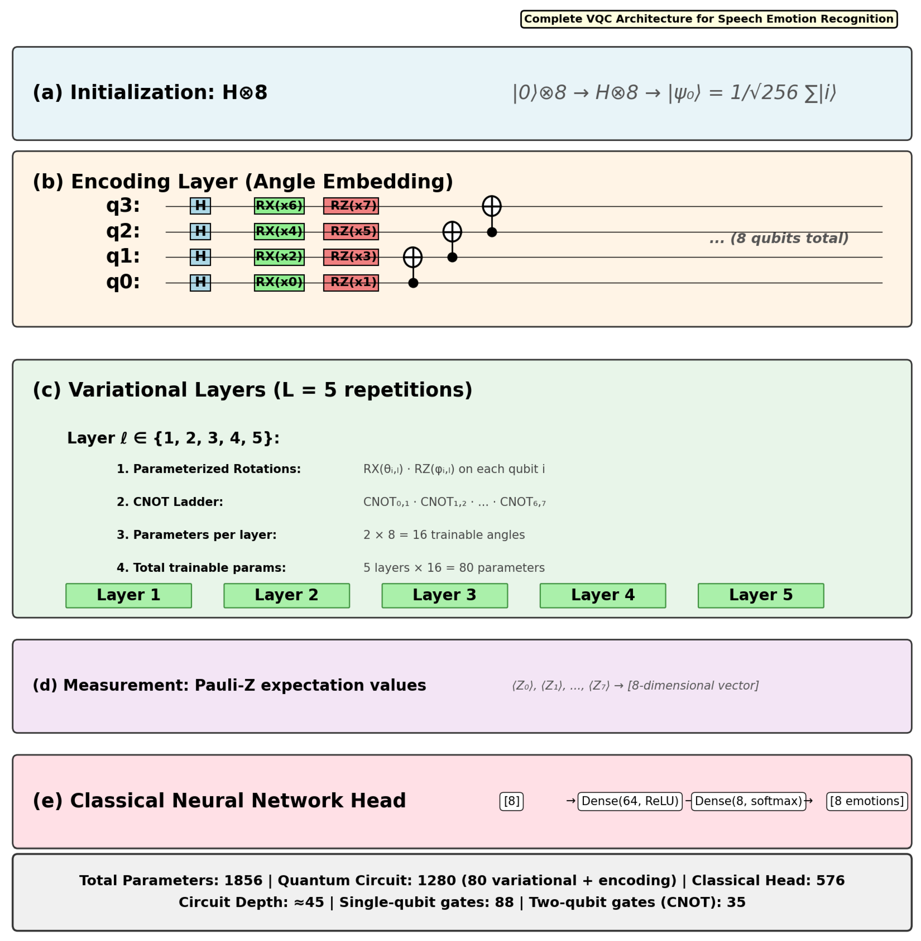 - Data Encoding: Angle embedding (Appendix B.1) applies rotation gates and to each qubit, where are z-score-normalised MFCC features.