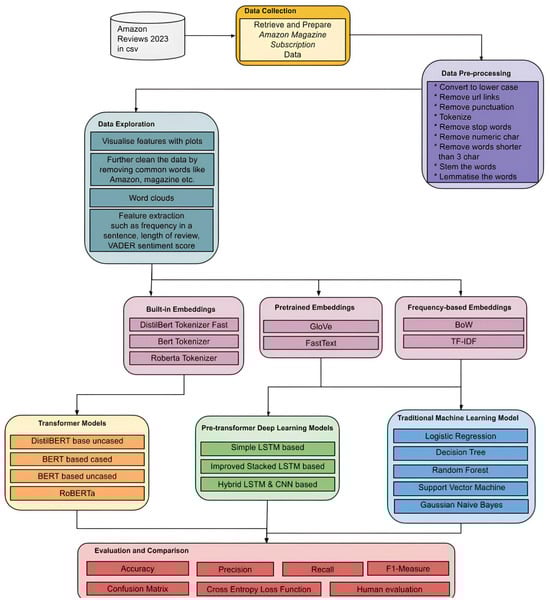 The objective of this paper is to comprehensively evaluate the performance of various learning paradigms, ranging from traditional machine learning models to pre-transformer deep learning architectures and transformer-based models, on the sentiment analysis task using Amazon customer reviews of magazine subscriptions. A central focus is to assess the impact of different embedding techniques, including frequency-based static methods such as Bag of Words and TF-IDF, pre-trained word embeddings such as GloVe and FastText, and contextual embeddings used by transformer models. In addition to performance evaluation, this study aims to identify the types of reviews where the models encounter the most difficulties, thereby providing deeper insight into the models’ limitations. By systematically comparing these approaches under consistent experimental conditions, our work highlights the strengths and weaknesses of each modelling and embedding combination. The results should assist researchers and practitioners in selecting suitable strategies for real-world applications of sentiment analysis, particularly in e-commerce and customer feedback systems. Ultimately, this study contributes to the growing literature by providing detailed, multi-level benchmarking and revealing trade-offs in performance that are often overlooked in isolated evaluations. The next section, Section 3, describes the adopted methodology in greater detail.