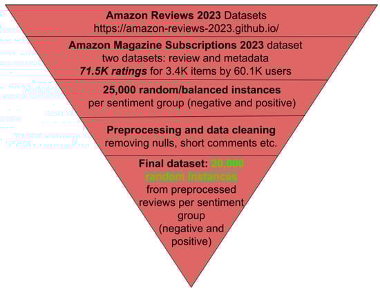 Most previous research applies sentiment analysis models to general datasets, whereas this study focuses specifically on the Amazon Magazine Subscription Reviews (2023) dataset (https://amazon-reviews-2023.github.io/, accessed on 19 November 2025), thereby ensuring the relevance and robustness of our findings. The dataset used forms part of the collection gathered by McAuley Lab [].