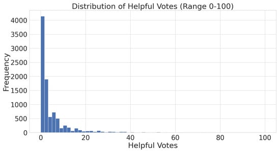 Another feature in the data is helpful_vote, which indicates how many people found a particular review helpful by clicking the helpful button. The value for helpful_vote ranges from 0 to an integer maximum, which is 2169 in our dataset. We explored the general trend in the number of helpful votes a review attracts. Figure 4 shows the distribution of reviews that have received helpful votes, ranging from 0 to 100. It shows that the majority of reviews, over 40,000, have not received any helpful votes. The number of reviews that received more than 20 helpful votes is also negligible.