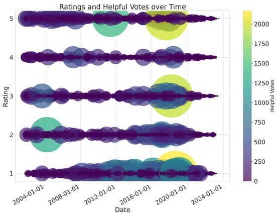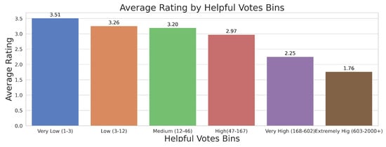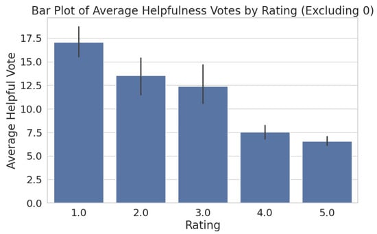 Figure 5 visualises the average number of helpfulness votes received by reviews, grouped by their star rating. To ensure meaningful analysis, reviews with zero helpful votes were excluded, focusing the results on those that elicited some user interaction. A clear negative correlation is observed between rating and average helpful votes, indicating that lower-rated reviews tend to receive significantly more user engagement in terms of helpfulness votes than higher-rated reviews. This suggests that critical reviews are perceived as more useful by users.