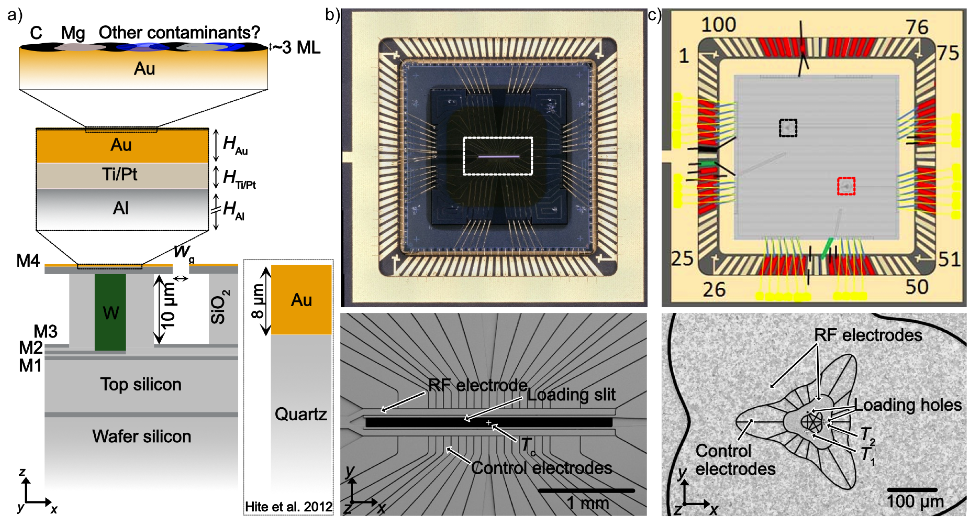 - Surface contamination and dielectric exposure: Prolonged exposure of the trap surface to ambient conditions before vacuum sealing can lead to adsorption of oxygen, hydrocarbons, and water, resulting in an unknown and spatially varying contamination load. Such uncontrolled variations are consistent with the large spread in electric-field noise observed across nominally identical traps [23]. Even after sputter cleaning, residual adsorbates may remain near the metal surface and alter local work functions. Slow surface migration of adsorbed species at ambient temperature could further modify the spatial distribution of dipoles over time, thereby influencing electric-field fluctuations [36,64]. Excessive sputtering may also thin the top metal stack and locally expose dielectric regions, which are known to host charge traps and contribute additional electric-field noise [65].