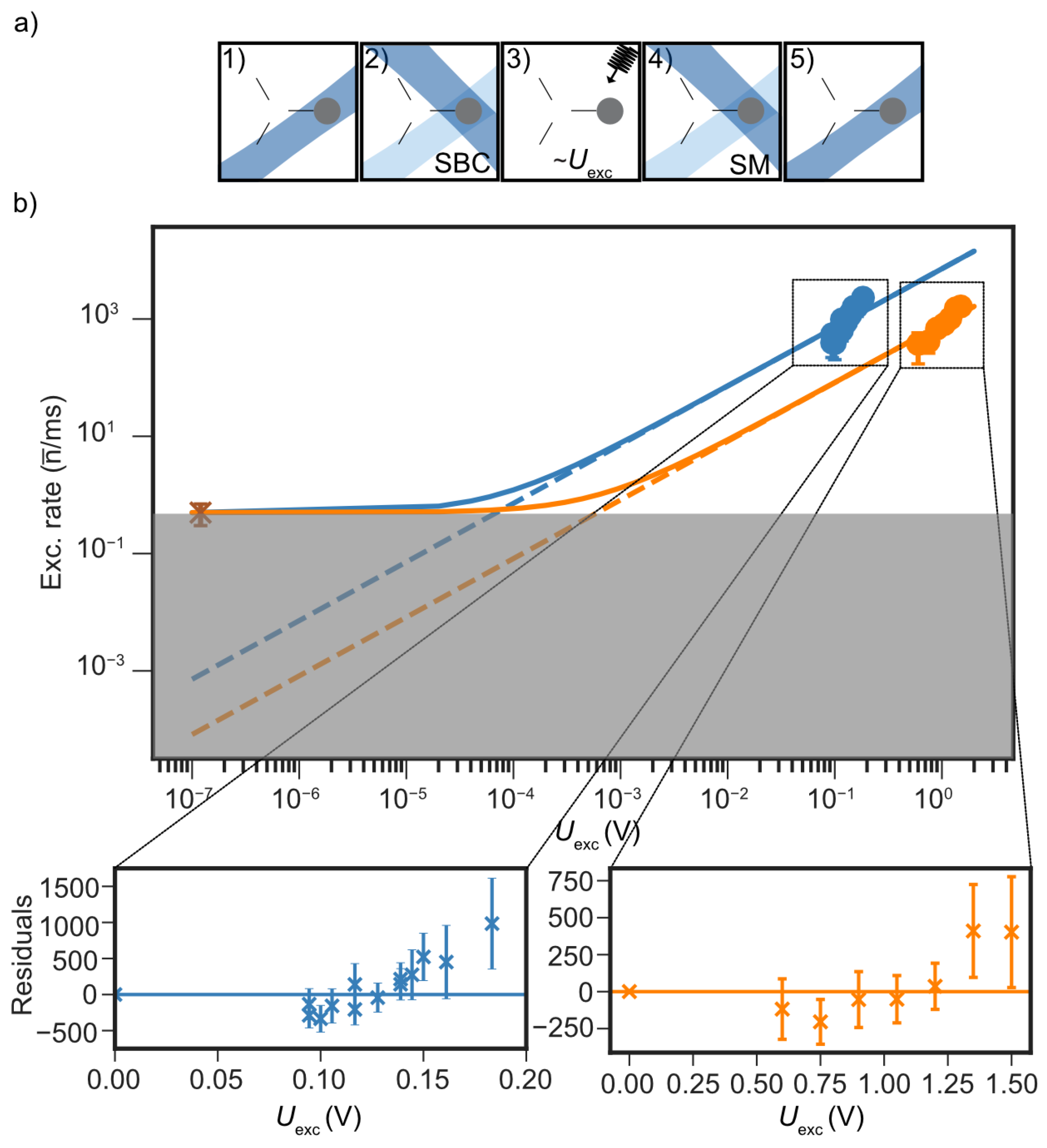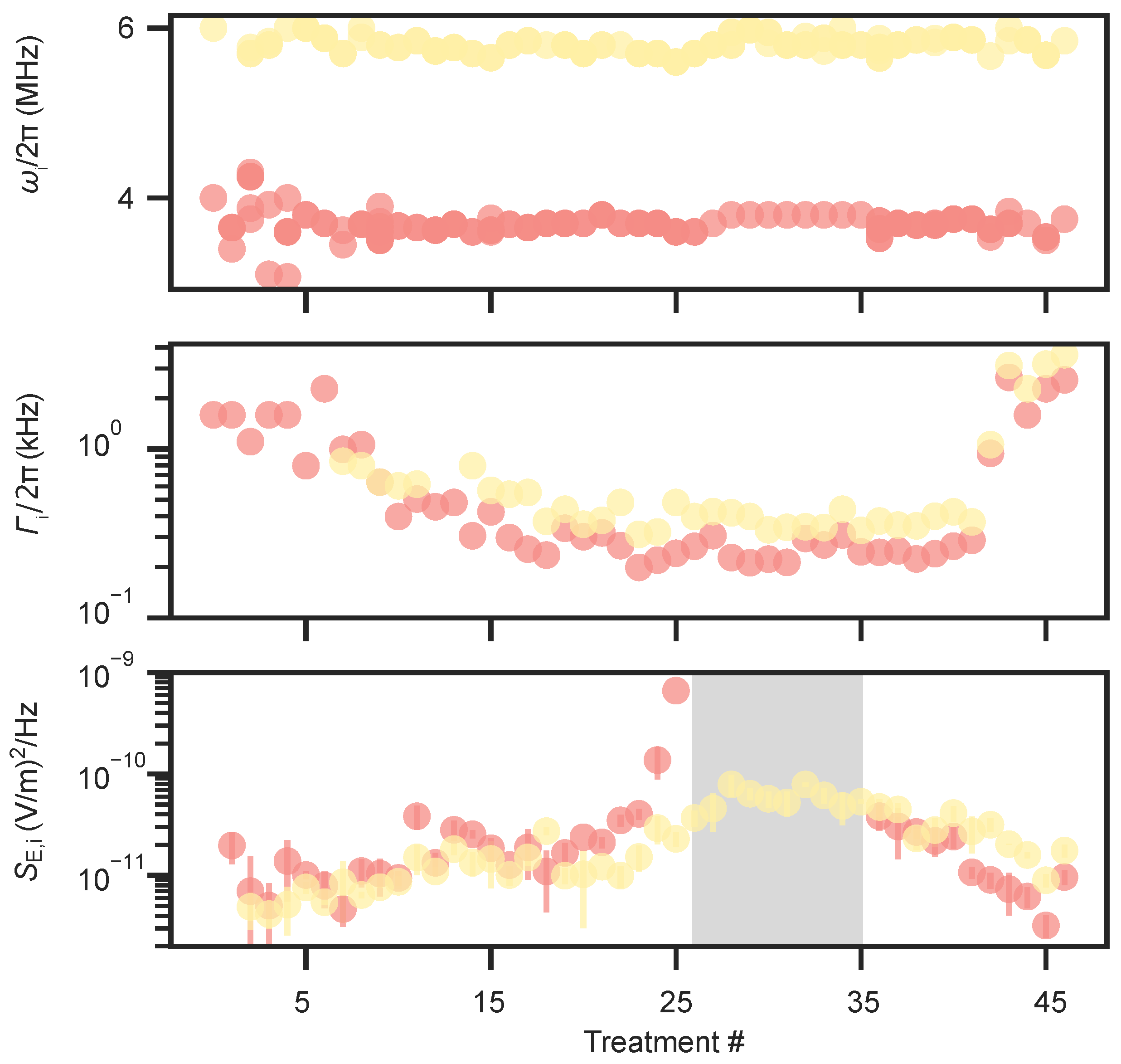 - Surface roughening and morphological modification: The changes in heating and dephasing observed here can be qualitatively interpreted within the framework of thermally activated fluctuators. One study reported a similar non-monotonic behavior following successive ion treatments and attributed it to transient surface smoothing that increased the spatial correlation among fluctuators [23]. Within this picture, the initial removal of loosely bound contaminants shifts the activation-energy distribution of fluctuators toward higher energies, suppressing slow patch-potential drifts and improving motional coherence, while the temporary smoothing enhances high-frequency noise and thus motional heating. As sputtering continues, progressive roughening could break these correlations, which broadens the fluctuator distribution, and leads to a reduction in accompanied by an increase in dephasing. In contrast, another study observed comparable non-monotonic heating behavior when only a few monolayers of contaminants remained on the surface, suggesting that residual adsorbates, rather than morphological evolution alone, may play a dominant role [60]. Additionally, under oblique ion-beam incidence, curvature-dependent sputter erosion can lead to the onset of nanoscale ripple patterns on the surface [66]. Such directional roughening may modify the local electric-field environment, potentially contributing to spatial variations in the field experienced by the trapped ions. Together, these experimental and theoretical insights [67] suggest that both surface morphology and adsorbate coverage jointly influence the spatial correlations of fluctuating surface dipoles, contributing to the complex, non-monotonic noise evolution observed in this work. It thus appears that surface cleaning, while often necessary, may not be sufficient to achieve low heating rates.