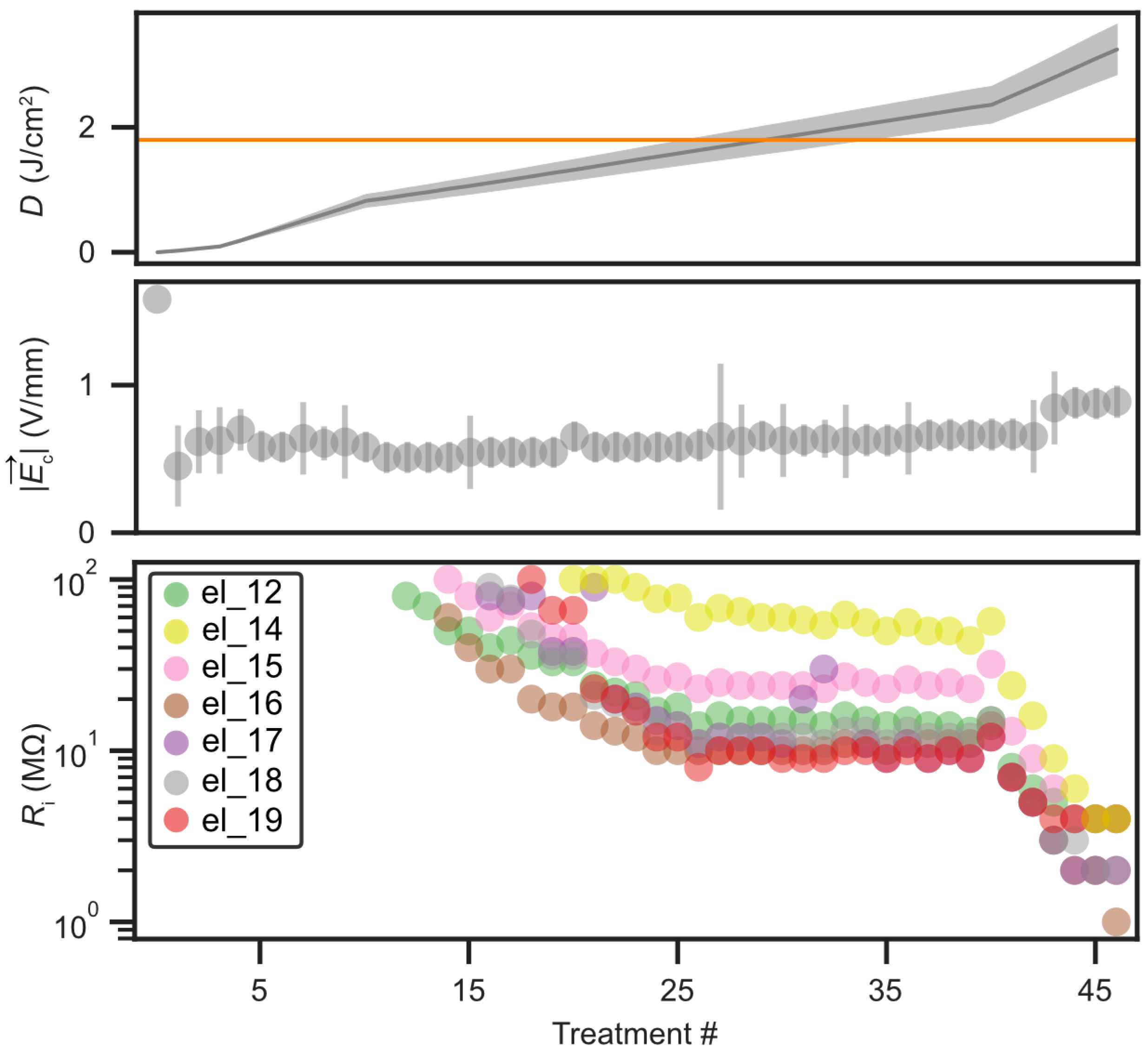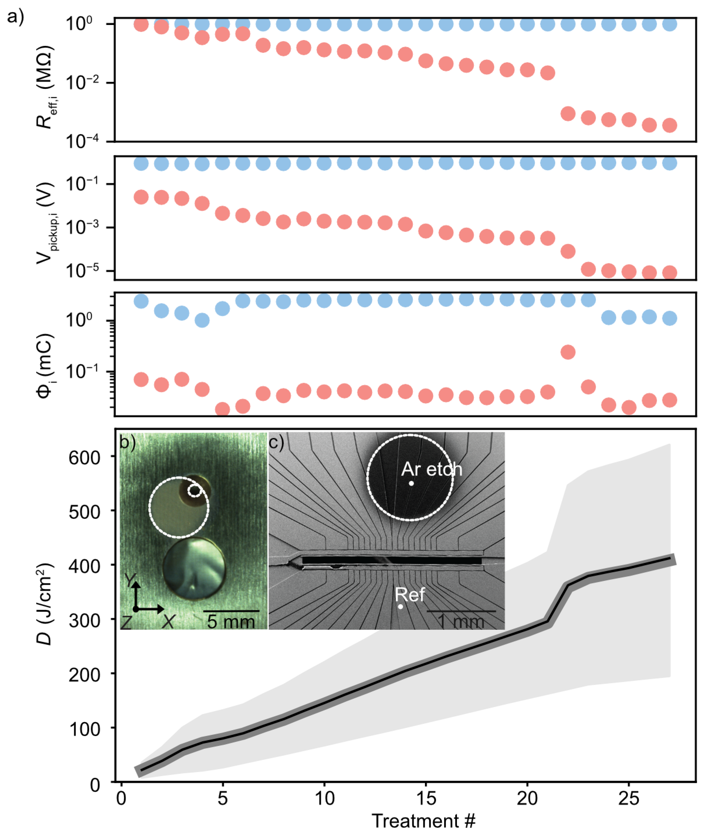 - Redeposition of sputtered material: Sputtered atoms originating from both the electrode surfaces and the nearby mask, predominantly Au from the top layer and the gold-plated mask but also Pt, Ti, Al, and trace Cu, can re-adsorb non-uniformly across the trap surface. Such multi-material redeposition alters the local work function and creates microscopic potential gradients that manifest as quasi-static patch potentials and broadband electric-field noise. In addition to larger-scale coverage variations, redeposition may also form nanoscale clusters or atomic patches of metals distinct from the underlying layer (for example, small Al or Ti aggregates on Au), which can further enhance work-function contrast and local electric-field fluctuations [16]. This process is analogous to oven loading, where unintentional deposition of atomic species on trap electrodes is known to modify stray fields and increase heating [16]. We also observe the gradual formation of electrical connections between neighboring electrodes, evidenced by a measurable decrease in their ohmic resistance from the nominally open state toward values of order 0.1–1 MΩ. These conductive bridges are consistent with metallic redeposition and may introduce additional Johnson and current shot noise, as well as time-dependent resistance fluctuations when small currents flow through these connections during operation.” The redeposition efficiency and resulting electrical coupling depend strongly on the sputtering geometry, ion-incidence angle, and masking configuration, and are particularly enhanced in in situ treatments where re-adsorption paths are not actively shielded.
