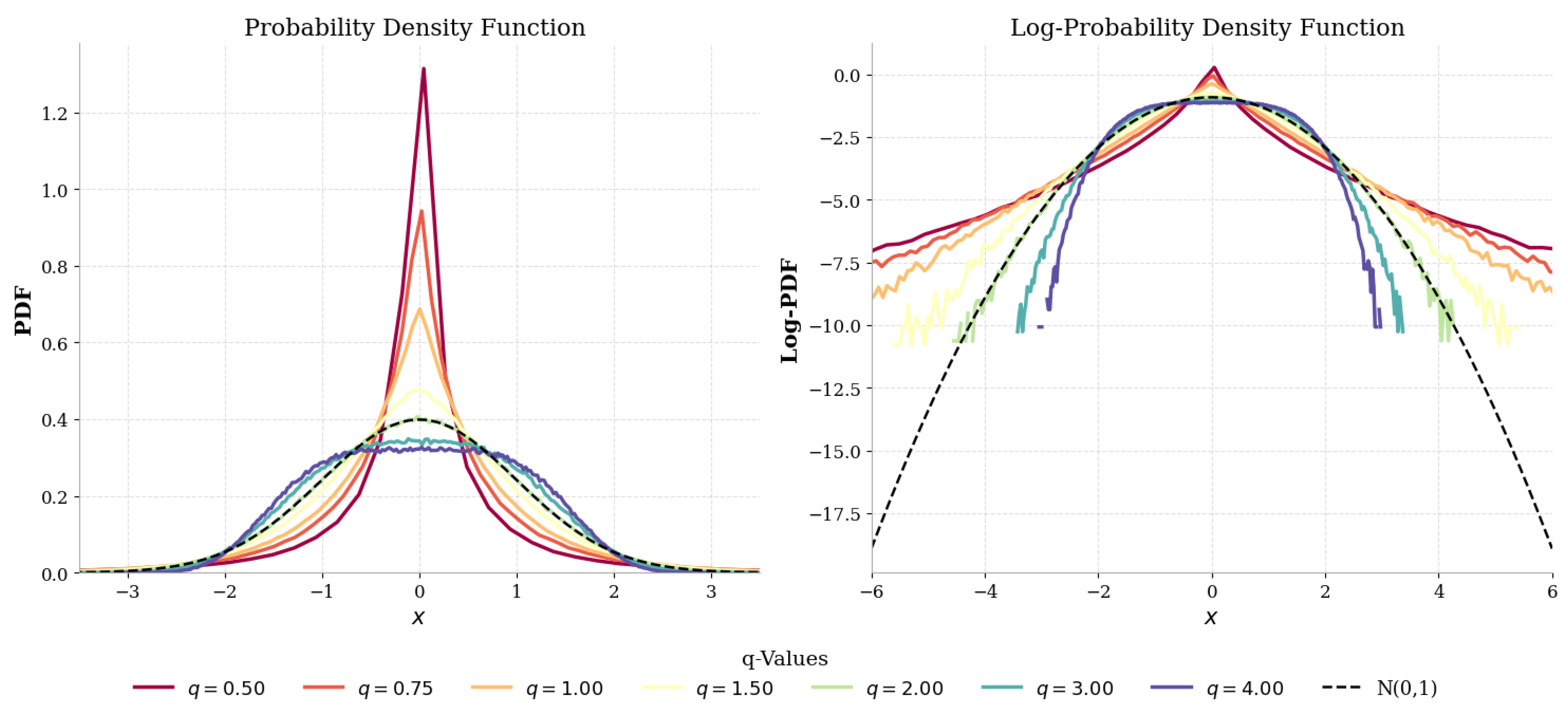 - Case (heavy tails). The power-law exponent can be matched with that of a multivariate Student distribution to obtainThe q-Gaussian is equivalent to the multivariate Student- distribution up to a scaling of . Therefore,in other words, follows a scaled F (or, equivalently, Beta-prime) distribution. Equivalently,with and independent.