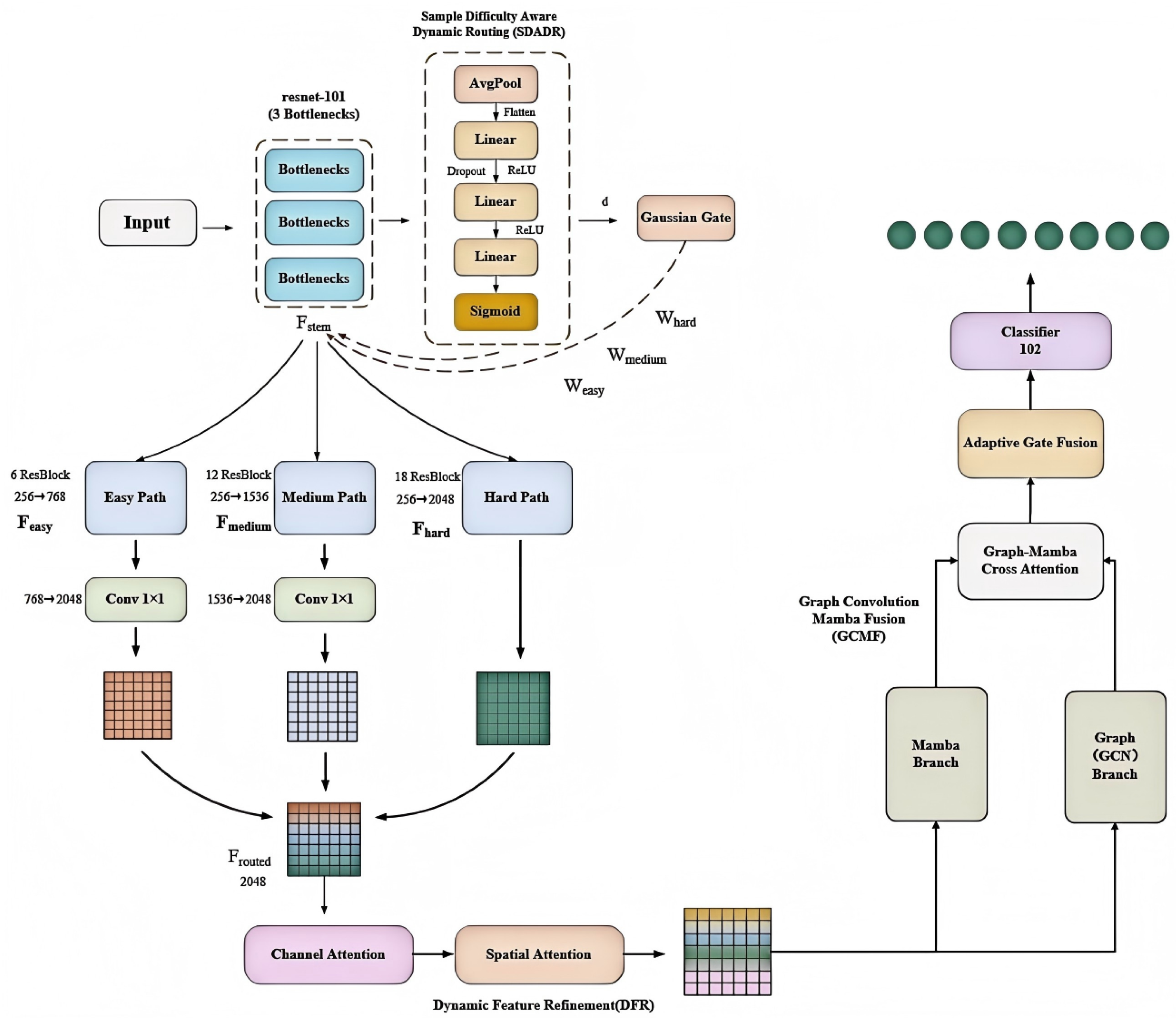 - Sample-Difficulty-Aware Dynamic Routing (SDADR) employs a lightweight difficulty predictor with Gaussian gating to adaptively route samples through shallow, medium, or deep paths. This mechanism matches computational depth to sample complexity, enabling efficient processing of easy samples while allocating sufficient capacity for difficult ones.