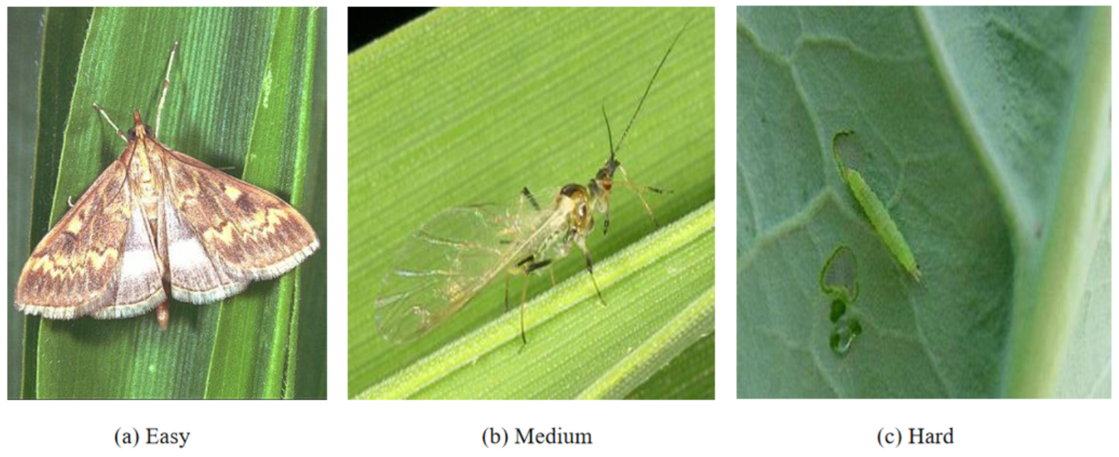 - Hard sample: A 3 mm heavily camouflaged mantis nymph on foliage, captured in field conditions with motion blur. The small size, complex background, and camouflage demand deep semantic reasoning to distinguish subtle morphological cues from noise.