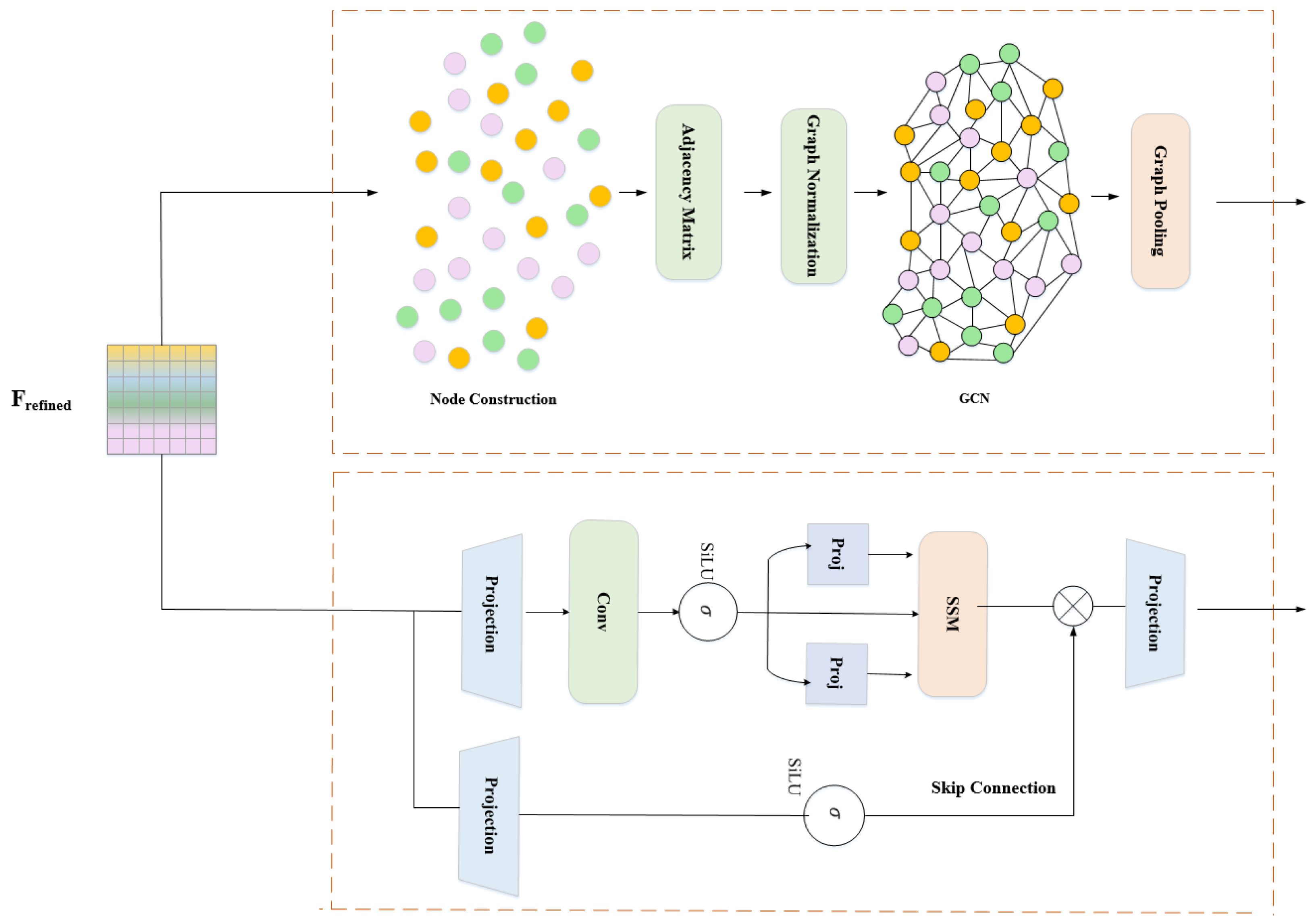 - Graph Convolution-Mamba Fusion (GCMF) captures complementary spatial–temporal information through parallel extraction: a multi-layer GCN with adaptive adjacency models spatial structural relationships via topological message passing, while selective Mamba with input-dependent parameters models temporal feature evolution with content-based filtering. This dual-branch design captures both anatomical connectivity and feature dynamics with linear complexity.