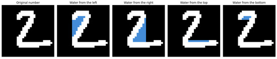 The core idea of the proposed method is to simulate a directional flooding process over the binary image of a digit. Conceptually, this process imitates the behavior of fluid spreading across the image from one of the four boundaries: left, right, top, or bottom. Each flooding direction is considered independently and contributes to the extraction of topological features that are invariant to rotation and resilient to noise. The idea behind the Flood-Fill Mechanism for the digit 2 is illustrated in Figure 1.