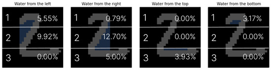 Each digit image is vertically partitioned into N equal segments, and the proportion of the flooded area is computed for each segment individually. The resulting values are aggregated into a feature vector that characterizes the directional water distribution across the digit. The concept of this mechanism is illustrated in Figure 3.