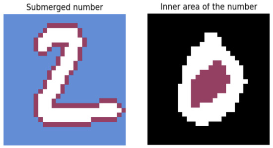 Figure 4. Illustration of the water-fill extension for enclosed regions in digits. - Digit Perimeter Estimation: The second parameter quantifies the degree to which the digit is surrounded by water. This is achieved by simulating the digit’s immersion in a water basin and computing its perimeter. The process is formalized as follows:Let be the binary matrix representing the digit, and let represent the enclosed regions identified in the previous step. The combined matrix C is defined asThe normalized perimeter P is computed aswhere the following apply: