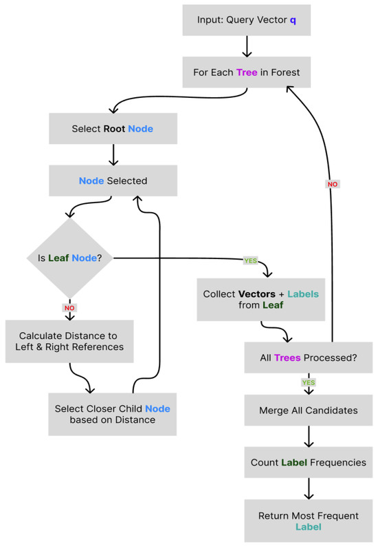 The method employs recursive binary space partitioning using randomly constructed trees. This method organizes the high-dimensional vector space into a hierarchical structure, enabling efficient nearest-neighbor retrieval via distance-based tree traversal. The algorithm integrates randomized node selection with ensemble aggregation to balance classification accuracy and computational efficiency.