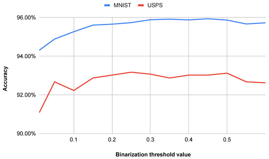 The binarization threshold was observed to have a minor effect on the classification accuracy, with variations of approximately for the MNIST dataset and around for the USPS dataset, the latter being slightly higher due to its increased noise. Empirically, the accuracy reached a maximum at a threshold value of around for both datasets. Consequently, this value was selected for subsequent experiments. Pixels with intensity values exceeding of the maximum possible intensity were assigned a value of 1, while all other pixels were assigned a value of 0. The relationship between the binarization threshold and the classification accuracy is illustrated in Figure 6, where it can be seen that deviations from the optimal threshold lead to a gradual decrease in accuracy.