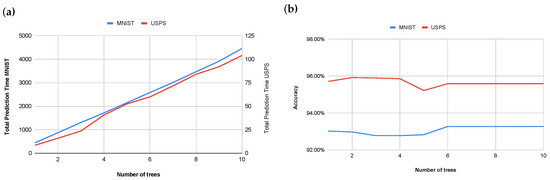 Figure 7a,b illustrate the relationship between the number of trees used in the ensemble model and both computational cost and classification accuracy. An examination of these results reveals that increasing the number of trees beyond two yields negligible improvements in model accuracy while concurrently leading to a consistent increase in computational cost. An initial increase from one to two trees demonstrated a marginal accuracy gain of 0.21 percentage points on MNIST (from to ) while no improvement was observed on the USPS dataset. Subsequent increases in the number of trees did not produce statistically significant or consistent improvements in accuracy. Indeed, certain configurations exhibited a slight reduction in accuracy, for example, on MNIST a decrease from at two trees to at five trees, and on USPS a decrease from at two trees to at five trees. From six to ten trees, the model accuracy plateaued at on MNIST and on USPS. This observed plateau in accuracy, despite increasing model complexity, suggests the potential for overfitting. Therefore, a value of two trees was selected for the ensemble model. This decision was based on the empirical observation that higher tree counts did not yield a perceptible improvement in prediction accuracy while concurrently resulting in a linear increase in computational prediction time. This approach thus optimizes for computational efficiency without a noticeable compromise in overall model performance.
