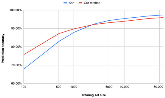 An additional advantage of the proposed method is its superior performance in terms of computational efficiency, dimensionality reduction, and accuracy on datasets smaller than 60,000 samples. Other approaches that achieve similar accuracy are often far more complex and less interpretable [34,35], while our approach remains efficient and transparent. Figure 8 illustrates the impact of the number of training set samples on the classification accuracy for both the k-NN method and our proposed approach (water simulation). For smaller datasets (below approximately 20,000 samples), the water simulation method achieves higher accuracy. For datasets larger than 20,000 samples, our method yields slightly lower, yet still comparable, accuracy. It is worth noting, however, that the computation time is significantly shorter, as shown in Figure 9.