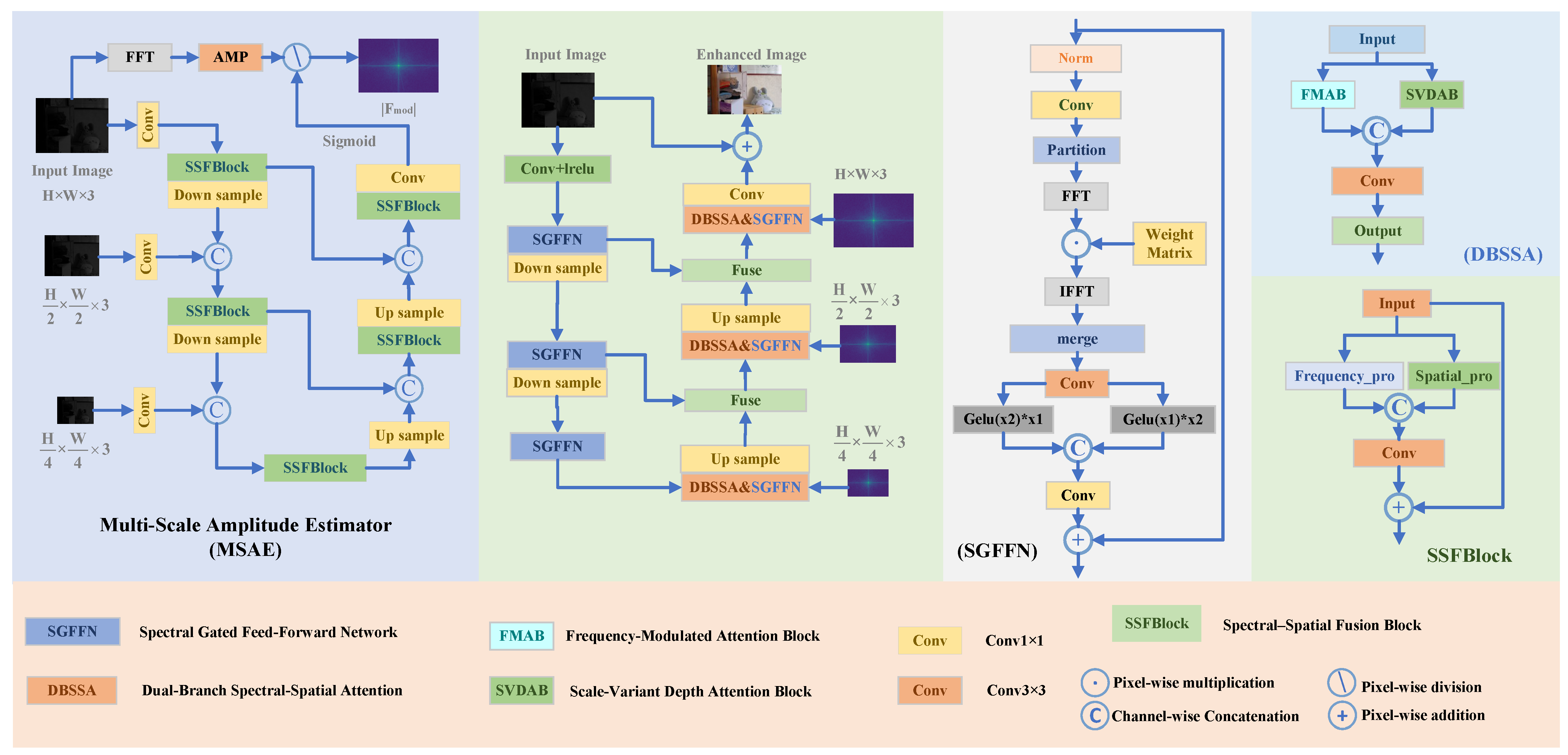 - We innovatively design the Multi-Scale Amplitude Estimator (MSAE), which generates pixel-level, content-adaptive amplitude maps to overcome the limitations of static modulation. This module reframes illumination enhancement as a data-driven spectral regression task, enabling scene-specific compensation and significantly improved generalization under non-uniform or multi-source lighting conditions.