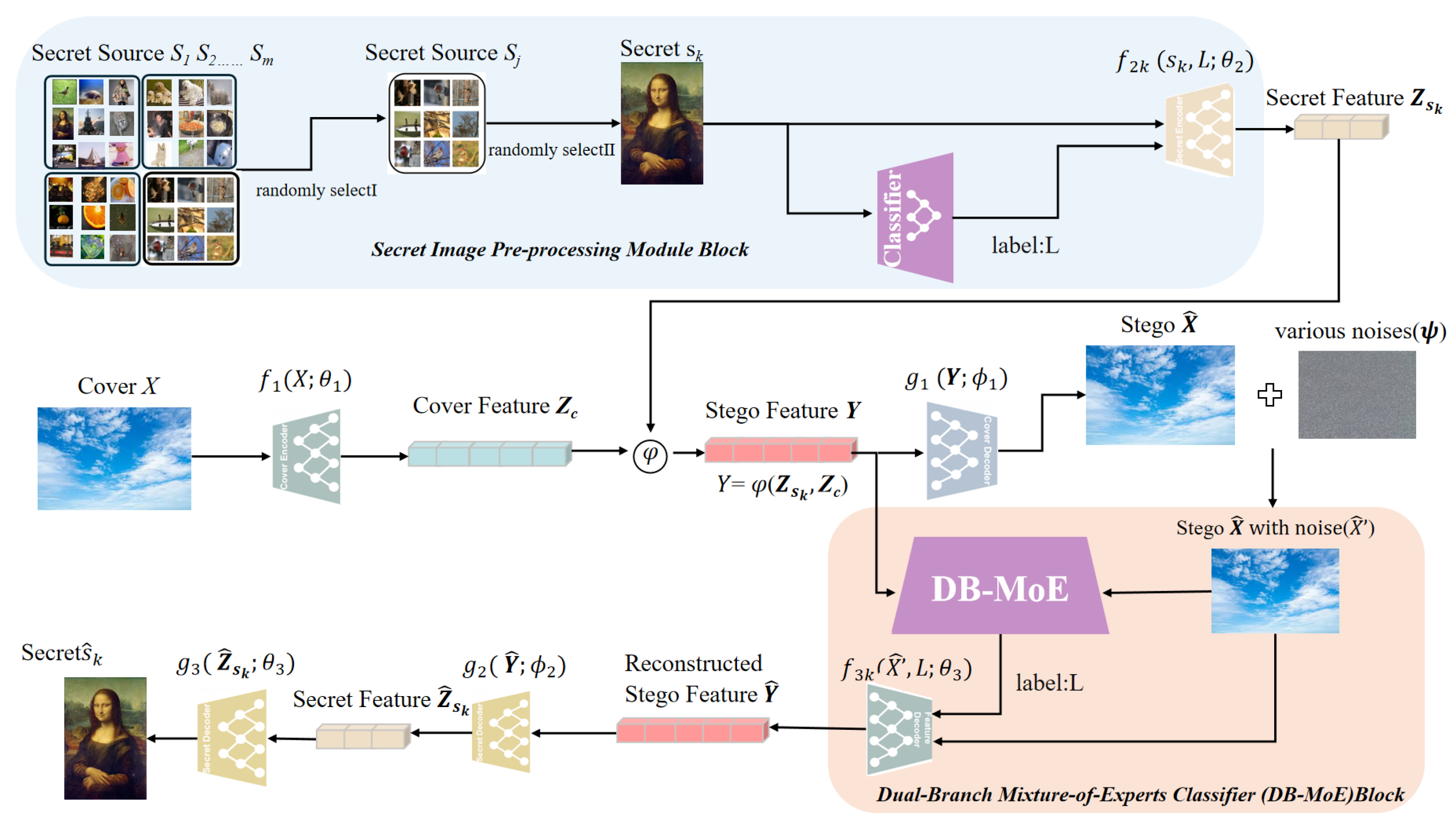 On the reconstruction side, the architecture is designed to separate secret-related information from cover content in the latent space: the cover is encoded into a cover feature, the resized secret into a secret feature, and the two are fused into a shared stego representation that is decoded along the single expert path selected by the semantic label. A dedicated secret decoder branch operates on this stego feature, and joint losses on cover fidelity, stego fidelity, and secret reconstruction encourage disentanglement between cover and secret information. The routing label is produced by a lightweight dual-branch selector that combines evidence from the fused stego feature and the (potentially noisy) stego image. Covers and secrets are drawn from disjoint pools, while the same heterogeneous secret pool is shared between the pre-processing classifier and the hiding/recovery modules, and the cover encoder is independent of the secret label, whereas the secret branch does not depend on the cover type. As a result, the method is intended to remain robust whether the cover and secret belong to the same semantic category or not, a behavior confirmed empirically on diverse datasets.