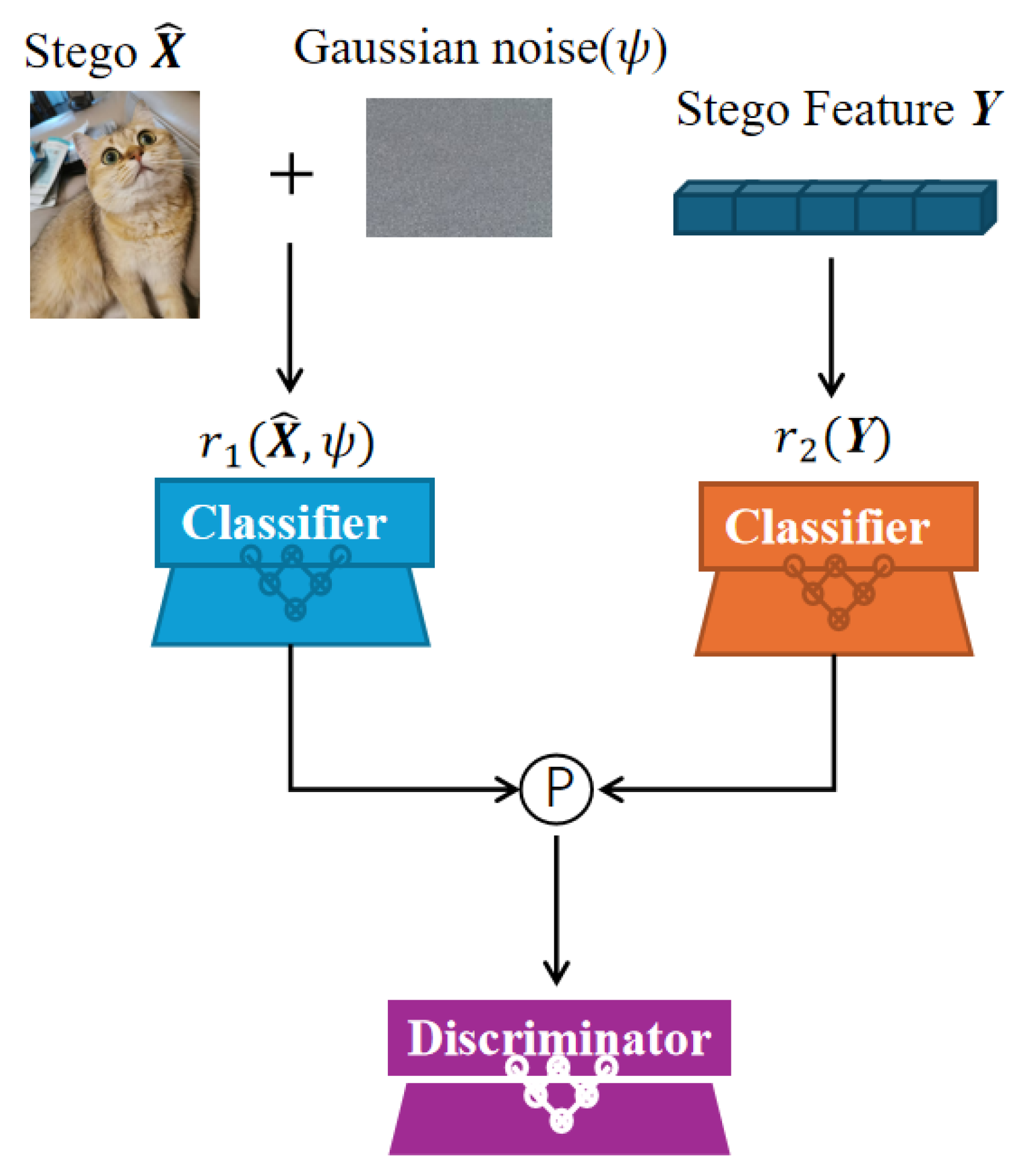 Figure 1, the proposed framework first initiates with the pre-processing of the secret image, where salient features—such as texture, structure, and color distribution—are extracted and a semantic label is assigned to categorize the image (e.g., scenery, facial, or pet images). Following pre-processing, the secret data is embedded into the cover image, as the second part, through a multi-encoder–decoder architecture, employing specialized encoder–decoder pairs tailored to the specific characteristics of each secret data category. The encoder transforms the cover image into a latent space, where it is subsequently combined with the secret data and passed through the decoder, resulting in the stego image while minimizing perceptual distortion. Third, to simulate real-world distortions, noise is intentionally introduced to the stego image, enhancing the robustness of the framework against various attacks. Then, the noisy stego image is processed by a dual-parallel classifier: one classifier evaluates the high-level feature representation of the image, while the other operates directly on the noisy stego image itself. The outputs of both classifiers are integrated and passed to the decoder, which refines the secret recovery process. Eventually, the decoder reconstructs the original secret data with high fidelity, even in the presence of noise. This cohesive workflow facilitates efficient data embedding and recovery, maintaining imperceptibility while ensuring resilience to a wide range of distortions.