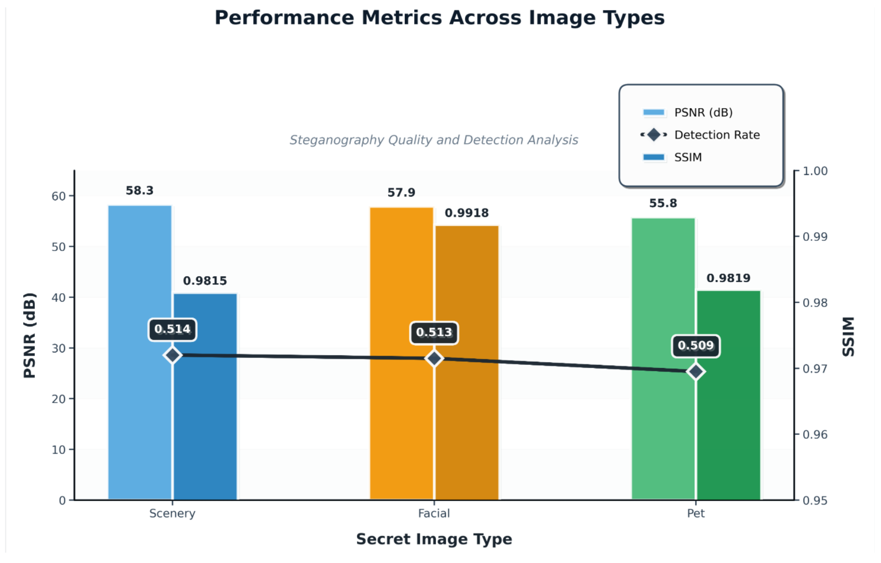Performance comparison across different image types: PSNR (left), SSIM (right), and detection rate (center). The model performs well on scenery, facial, and pet images, with consistently high PSNR and SSIM values. The detection rate is close to that of random guessing, which indicates high security for the hidden information.