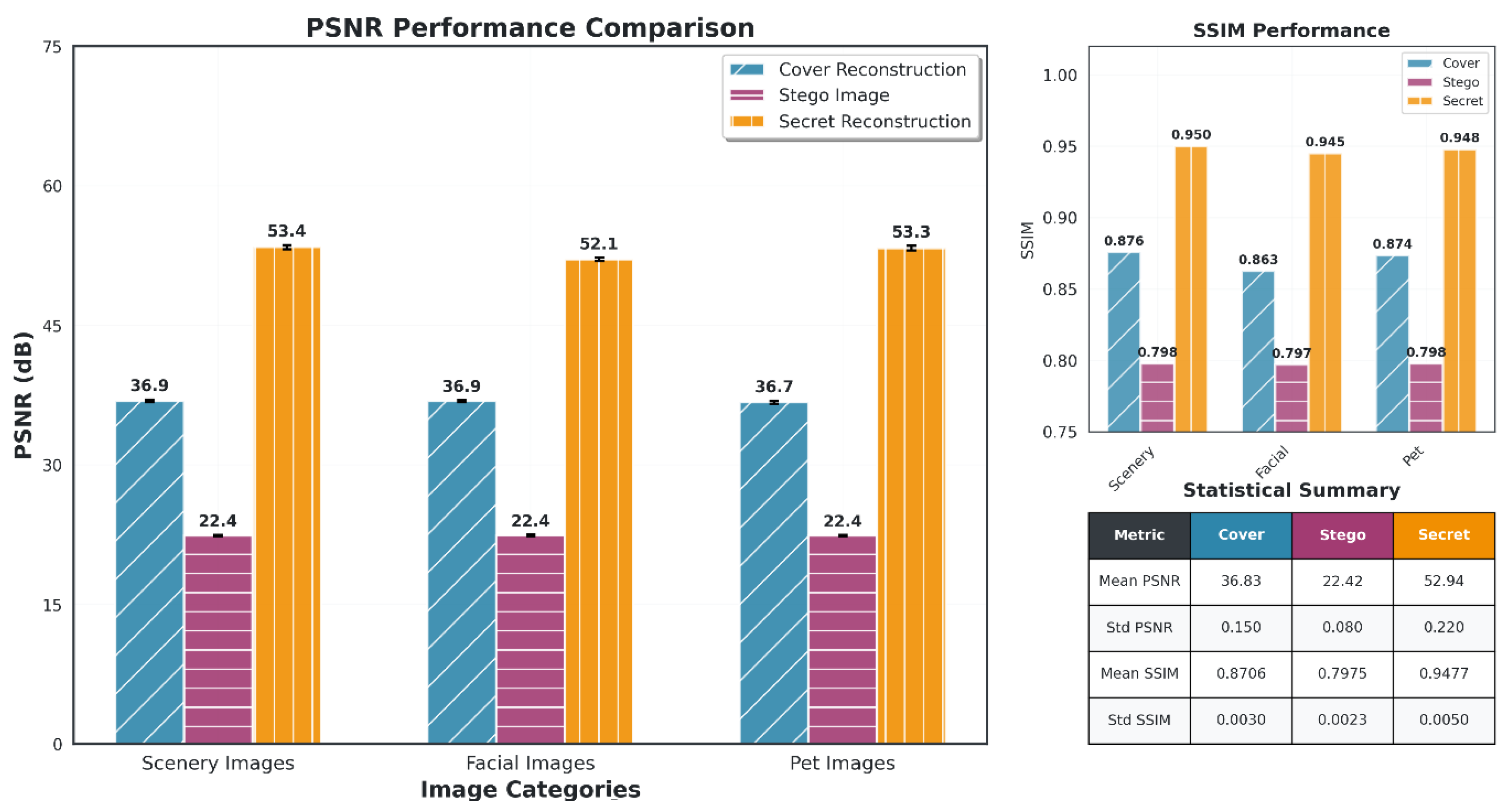 Performance comparison of PSNR and SSIM for cover reconstruction, stego image, and secret reconstruction across different image categories: scenery, facial, and pet Images. The statistical summary provides the mean PSNR, SSIM, and their respective standard deviations.