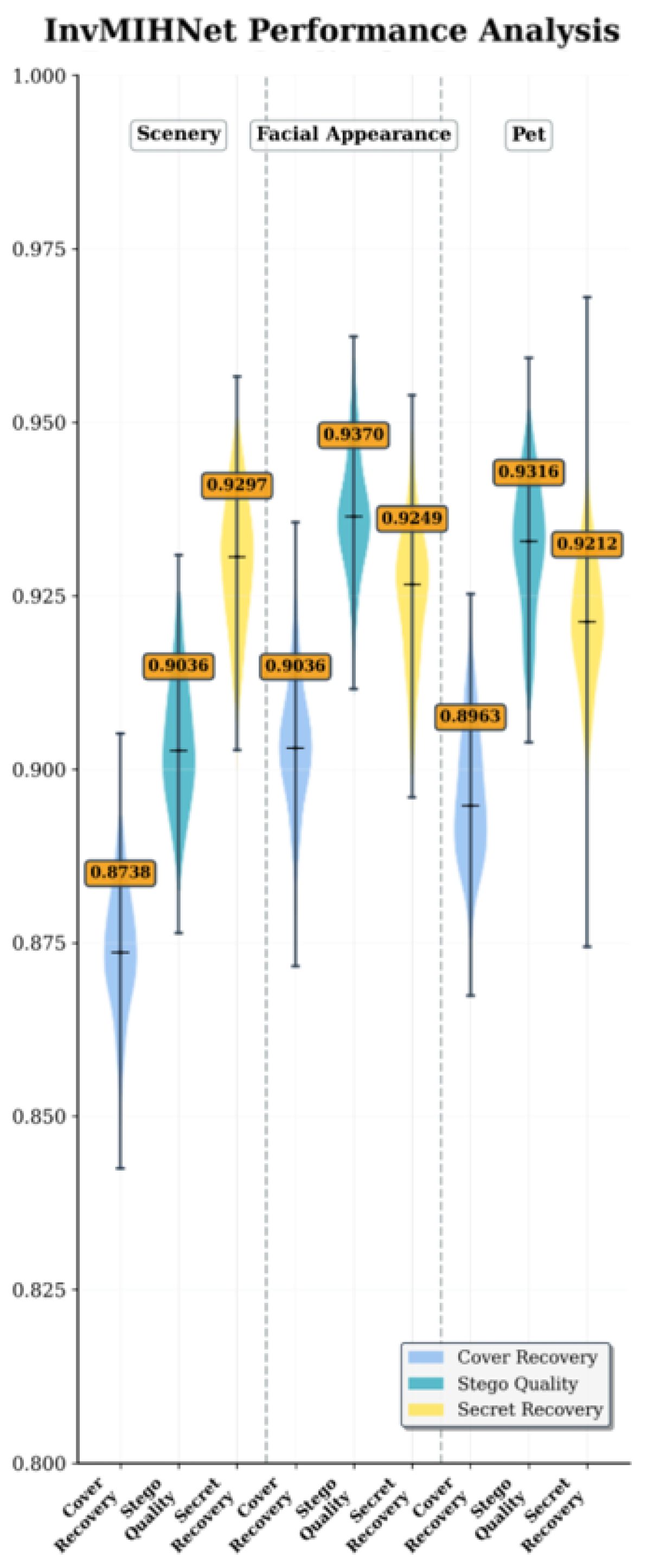 Violin plots of SSIM for InvMIHNet across categories (scenery, facial, pet), showing cover recovery, stego quality, and secret recovery. The y-axis represents the SSIM, with width indicating sample density, and orange labels denote mean values.