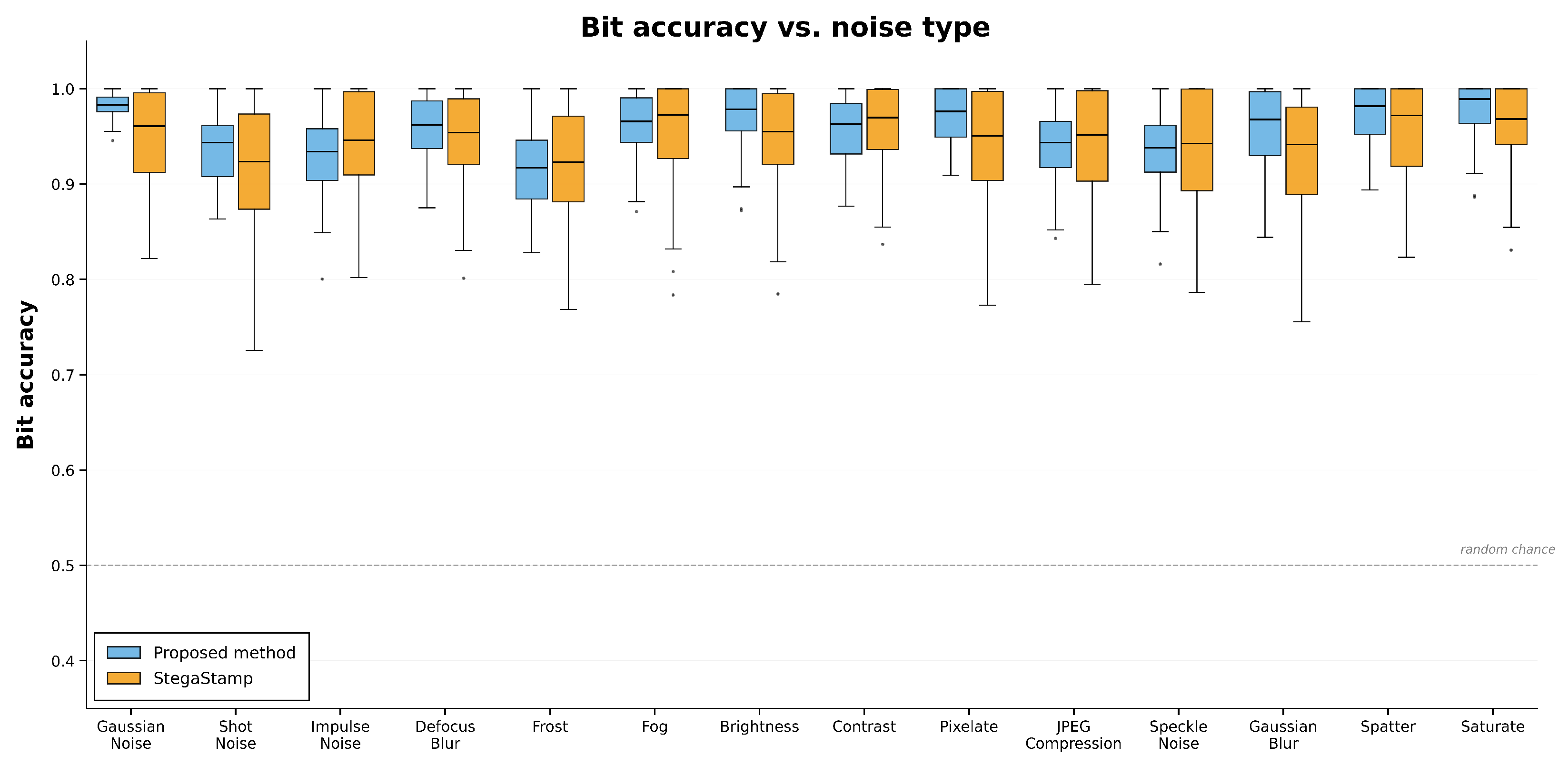 Reading guide: Box plots of bit accuracy (y-axis, 0–1; higher is better) for each noise type (x-axis). For every distortion, two boxes are shown—blue: proposed method; orange: StegaStamp (see legend). Each box spans the interquartile range (25–75%), and the central line is the median; whiskers extend to 1.5 × IQR, and dots denote outliers. The gray dashed line at 0.5 indicates random-chance accuracy. Compare median height and box position (closer to 1.0 is better) and the box width (narrower implies more stable performance) across noise types to assess robustness.