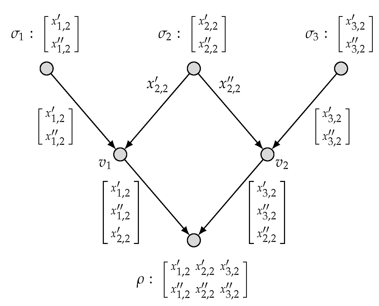 the set of input edges of v and the set of output edges of v, respectively. In the graph G , there is a set of source nodes S = { σ 1 , σ 2 , , σ s } V with | S | = s , and a single sink node ρ V S , where each source node has no input edges and the sink node ρ has no output edges, i.e., In ( σ i ) = Out ( ρ ) = for i = 1 , 2 , , s . Without loss of generality, we assume that for each v V { ρ } , there always exists a directed path from v to ρ in G . Let F q be a finite field of size q. We allow multiple edges between two nodes and assume that a symbol taken from the finite field F q can be transmitted with zero error on each edge for each use. The graph G , together with S and ρ , forms a network N , i.e., N = ( G , S , ρ ) .