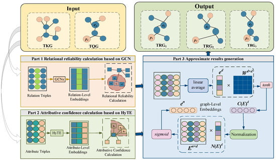 This subsection proposes an approximate querying method on TKG based on two-level embedding. At vertex-level embedding, we define relational reliability and attributive confidence to find approximate entities and attributes. At graph-level embedding, time information is used to enhance the embedding representation and find the approximate results. The framework is shown in Figure 2.