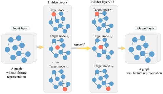 The Graph Convolutional Network has been proven to be effective in capturing information from graphs. It can learn the features of the pair of neighbor nodes, eh and et, in the relational triple <eh, tr, et>. The structure of the GCN is shown in Figure 4. The GCN takes the embedding representation of the nodes at layer l as input and computes the embedding representation at layer l + 1 by aggregating the embedding representations of neighbor nodes and its own nodes at layer l. The calculation method is as follows: