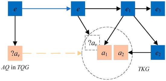 The attribute query <e, ta, ?av> is shown in Figure 6. When this query is executed, there is neither an attribute predicate nor an attribute matching the attribute query <e, ta, ?av> in the TKG. In the vector spaces of attribute triples, there are some approximate attributes (such as attribute a1 and attribute a2) that are similar to in TKG (represented by a square dashed box on the right of Figure 6). Moreover, most of the entities with these approximate attributes are adjacent to the entities in the attribute query (such as entity e1 and entity e2).