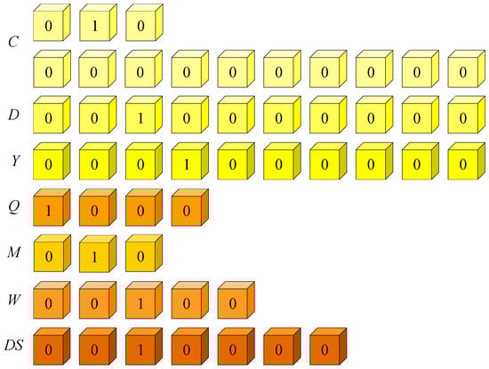 Referring to the coding of time information in the literature [35], time information (T) is divided into seven levels, namely century, decade, year, quarter, month, week, and day. These seven time levels are represented by sub-vectors (t), which are centuries (C), decades (D), years (Y), quarters (Q), months (M), weeks (W), and days (DS). The first three vectors are used to represent the year, the Q and M vectors are used to represent the month, and the W and DS vectors are used to represent a specific day. Each dimension of the vector has a value of 0 or 1. The dimension of the DS vector is 7. The values of each sub-vector are given in Figure 7. The core reason we employ a seven-level time encoding is to achieve a comprehensive, multi-granularity representation of temporal information within temporal knowledge graphs (TKGs). Real-world events and facts possess varying durations and granularities, ranging from long-term facts spanning centuries to short-term events lasting only days or weeks. This seven-level structure allows the model to simultaneously capture the context from the broadest scale (century) down to the most precise date, thereby greatly enhancing both representational capacity and robustness.