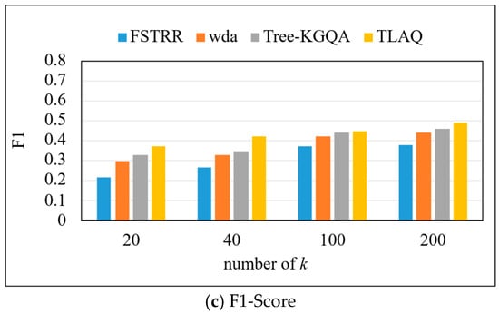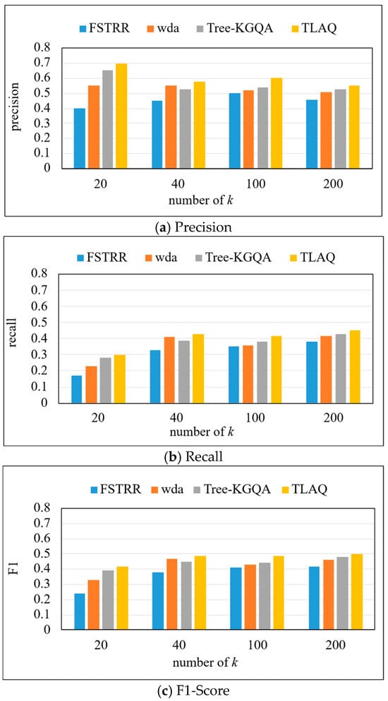 The precision, recall, and F1-Score on the QALD-6 dataset are shown in Figure 10 and Table 3. The experiment selects the first 20, 40, 100, and 200 query results, respectively, to calculate the precision, recall, and F1-Score of each query problem and calculate their average. Based on the data in Figure 10, horizontal analysis shows that with the increase in k, the precision of the four algorithms increases. Under four different k values, TLAQ shows advantages. Compared with FSRTT, the average performance improvement rates of WDA and Tree-KGQA are 66.7%, 25% and 12.3%, respectively, at k = 20. Although the precision of TLAQ is improved compared with other algorithms, the overall performance of the model is not as good as that of LC-QuAD dataset. There may be two reasons for the above phenomenon. The first is that LC-QuAD is a question–answer dataset published in 2017. The questions in the dataset are relatively simple, including most single-hop problems and untyped questions. So, most algorithms can achieve 50% or even 60% accuracy on this dataset. The second reason is that the QALD-6 dataset contains richer questions with additional entity information in the query results. In addition, complex questions in QALD-6 account for more than 40% of the total questions, and these questions contain more complex syntactic structures and semantic relations than LC-QuAD.