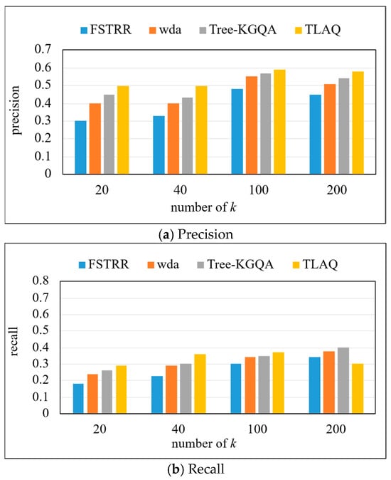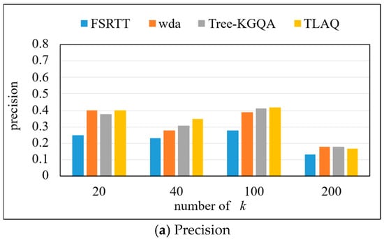 The precision, recall, and F1-Score on the QALD-6 dataset are shown in Figure 11 and Table 4. The experiment selects the first 20, 40, 100, and 200 query results, respectively, to calculate the precision, recall, and F1-Score of each query problem and calculate their average. Based on the data in Figure 11, horizontal analysis shows that the precision of the four methods has the same change trend, which increases first and then decreases, and reaches its highest when k = 100. When k = 100, the precision of TLAQ reaches 0.59. TLAQ shows advantages under four different k. At k = 40, the average performance improvement rates of WDA and Tree-KGQA are 66.7%, 25%, and 12.3%, respectively.
