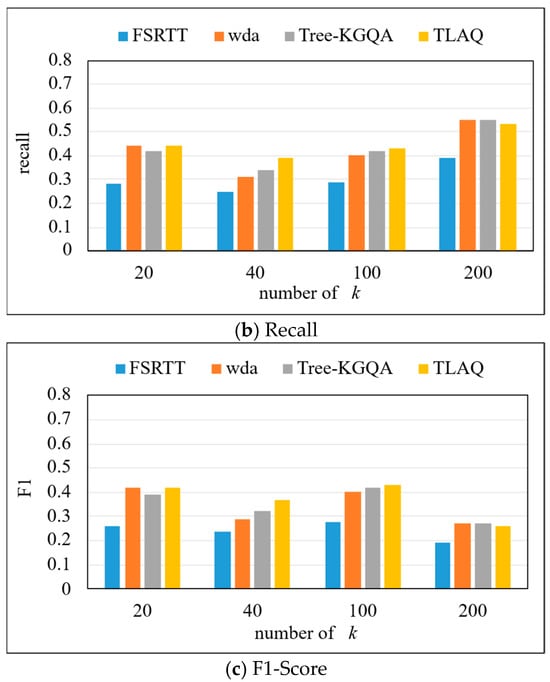Compared with the LC-QuAD dataset, the recall of the FSTRR algorithm decreases by 10.53%, the WDA algorithm decreases by 9.52%, and the Tree-KGQA algorithm decreases by 6.98% at k = 200. However, the TLAQ is relatively stable, and the F1-Score has been maintained at about 0.49. The F1-Score of the FSTRR algorithm decreased by 9.52%, the F1-Score of the WDA algorithm decreased by 4.35%, and the F1-Score of the Tree-KGQA algorithm decreased by 4.17%. However, the TLAQ is relatively stable, and the F1-Score has been maintained at about 0.49, with a fluctuation of 5.06%. This verifies the superiority of TLAQ from the side, and the performance on different datasets is not very different.