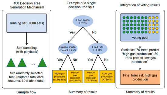 RF employs ensemble averaging to mitigate overfitting and quantify feature importance (Figure 3). Classification uses majority voting (Equation (6)), regression takes the mean of tree outputs (Equation (7)), and model error is measured by mean-squared error (Equation (8)). Optimal parameters—B = 100, depth = 18, mtry = 2—were obtained through grid/cross-validation (Table 3). The resulting feature-importance ranking (Section 3.2) reveals each variable’s contribution to biogas performance.