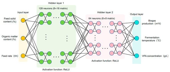 The ANN model consists of a two-layer fully connected feed-forward network ([128, 64] neurons; Figure 4) using ReLU activation (Equation (9)) and an output layer predicting biogas yield, temperature, and VFA simultaneously.