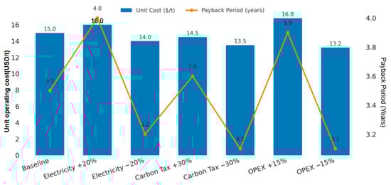 Sensitivity analysis of unit operating costs and payback period under different economic scenarios.