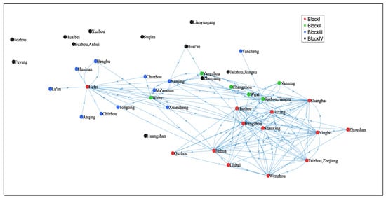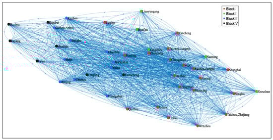The spatial clustering characteristics of each city in the YRD within the digital economy innovation correlation network in 2020 are revealed by using block model analysis. The Concor method is adopted, with the maximum segmentation depth set to 2 and the concentration standard set to 0.2. As a result, the 41 cities in the YRD are divided into four blocks. The division results are presented in Table 5.